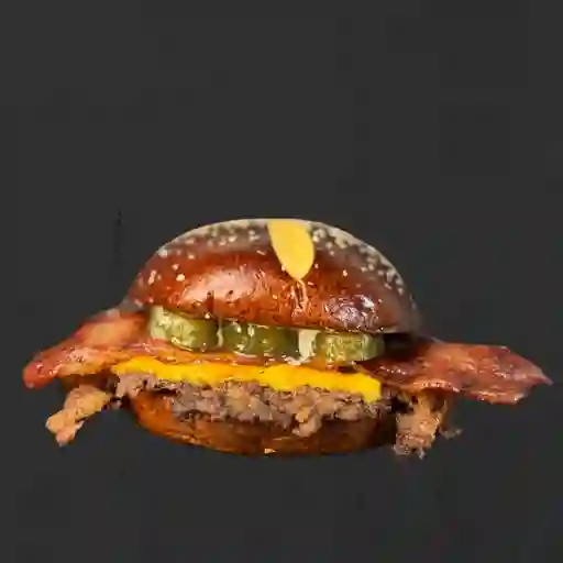 Pan pretzel o brioche, 100 g de carne angus smash, queso cheddar, doble tocineta bañada en una bbq en reducción de whisky jack daniel's honey tennessee, pepinillos y salsa wallace, acompañado de papas a la francesa.