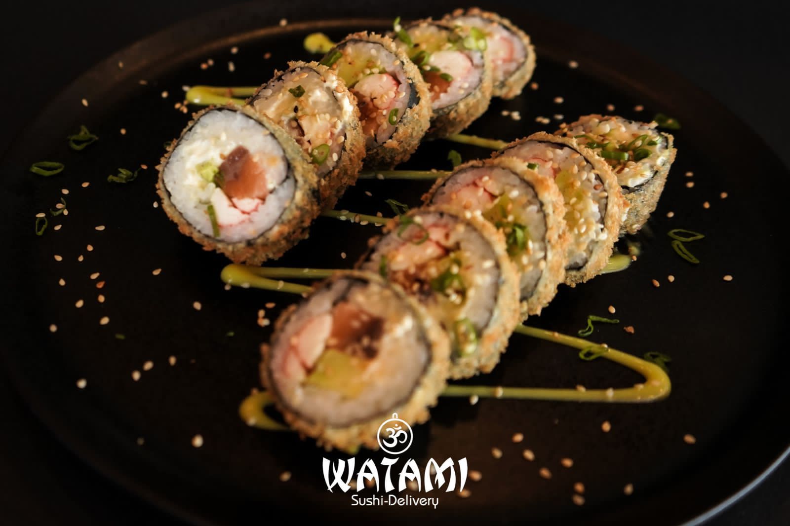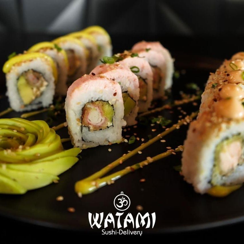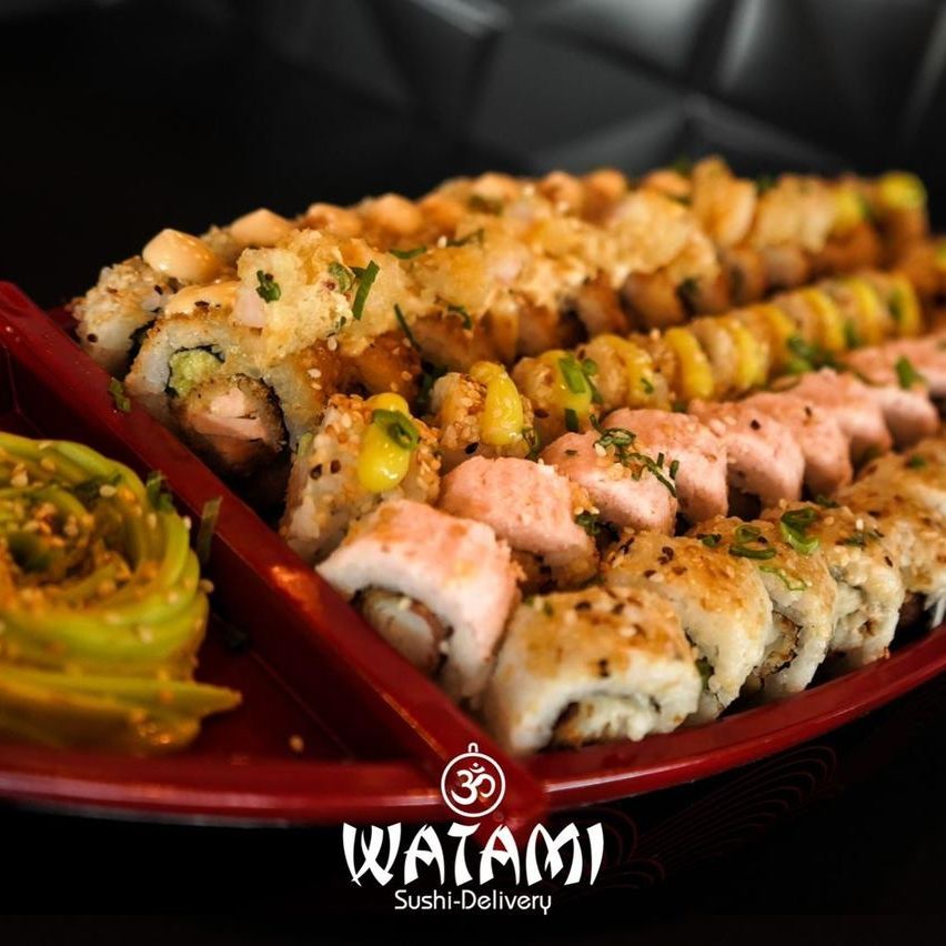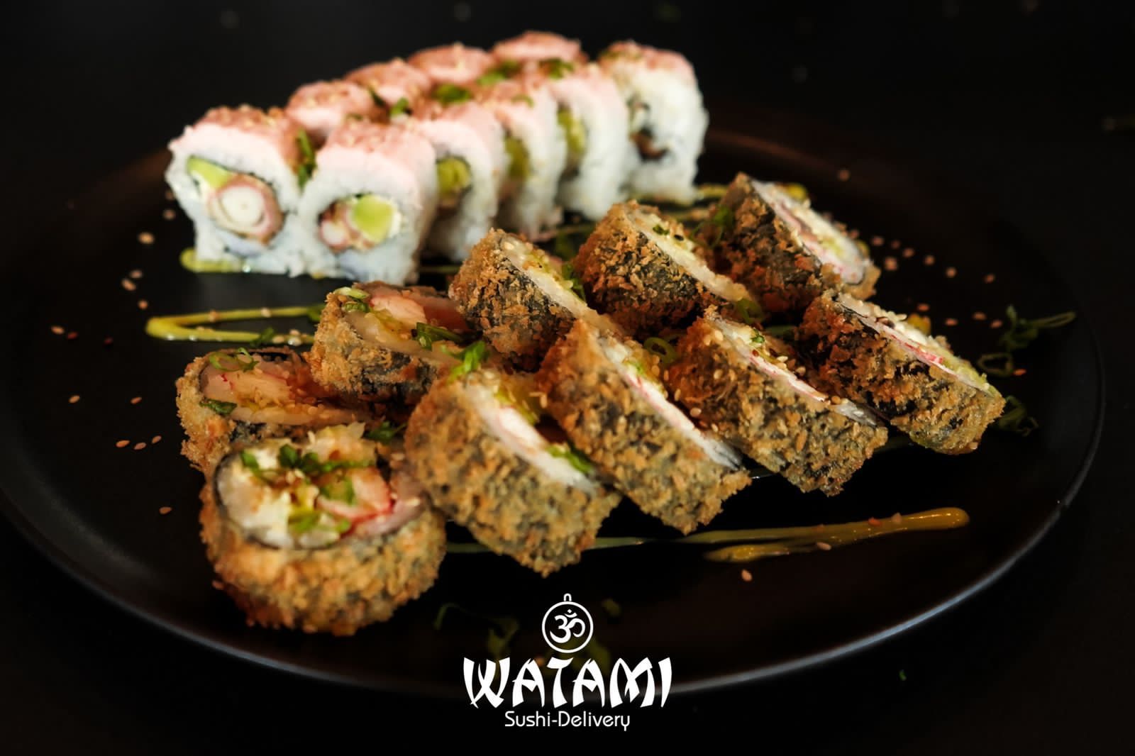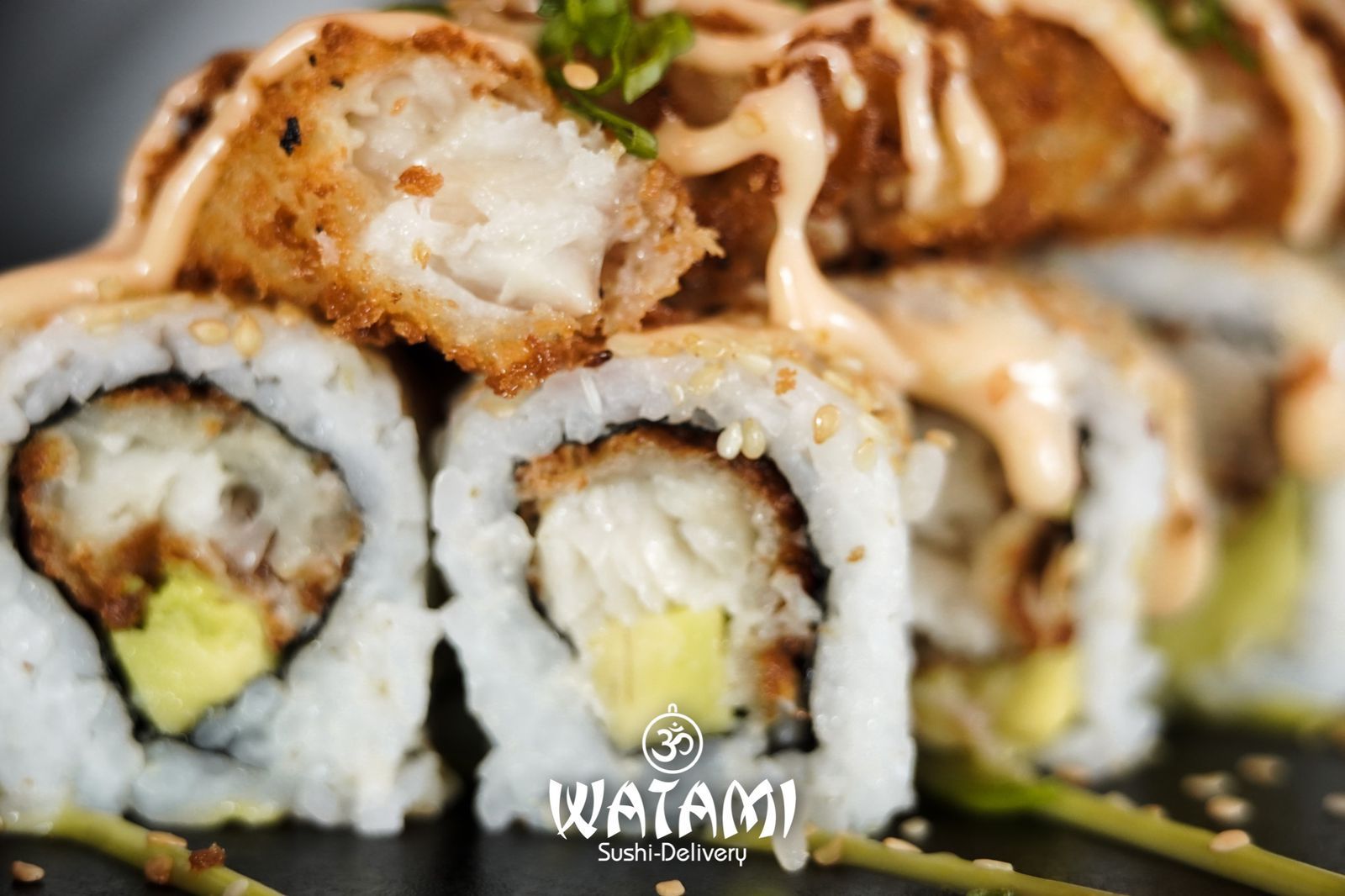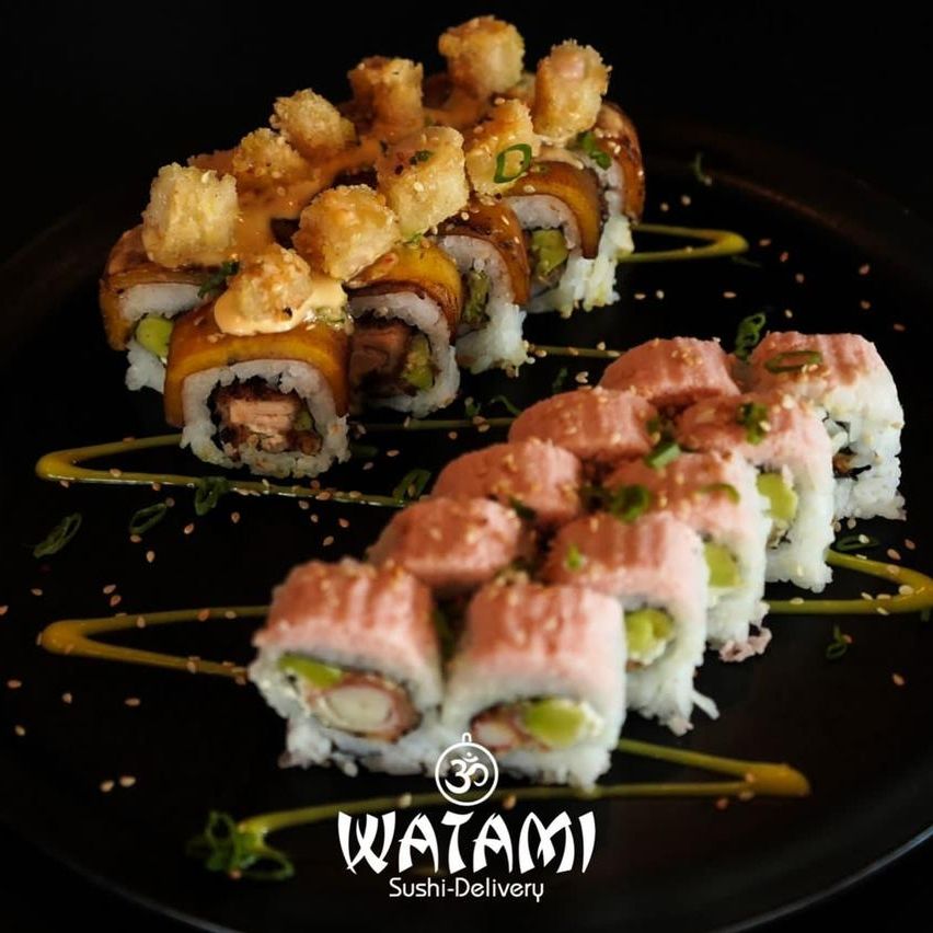 Maki con kanikama importado , langostinos apanados al panko , queso crema , aguacate , masago y ensalada watami especial.