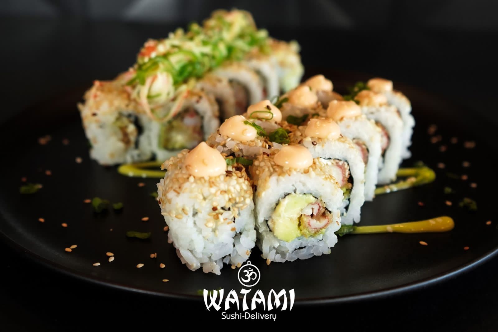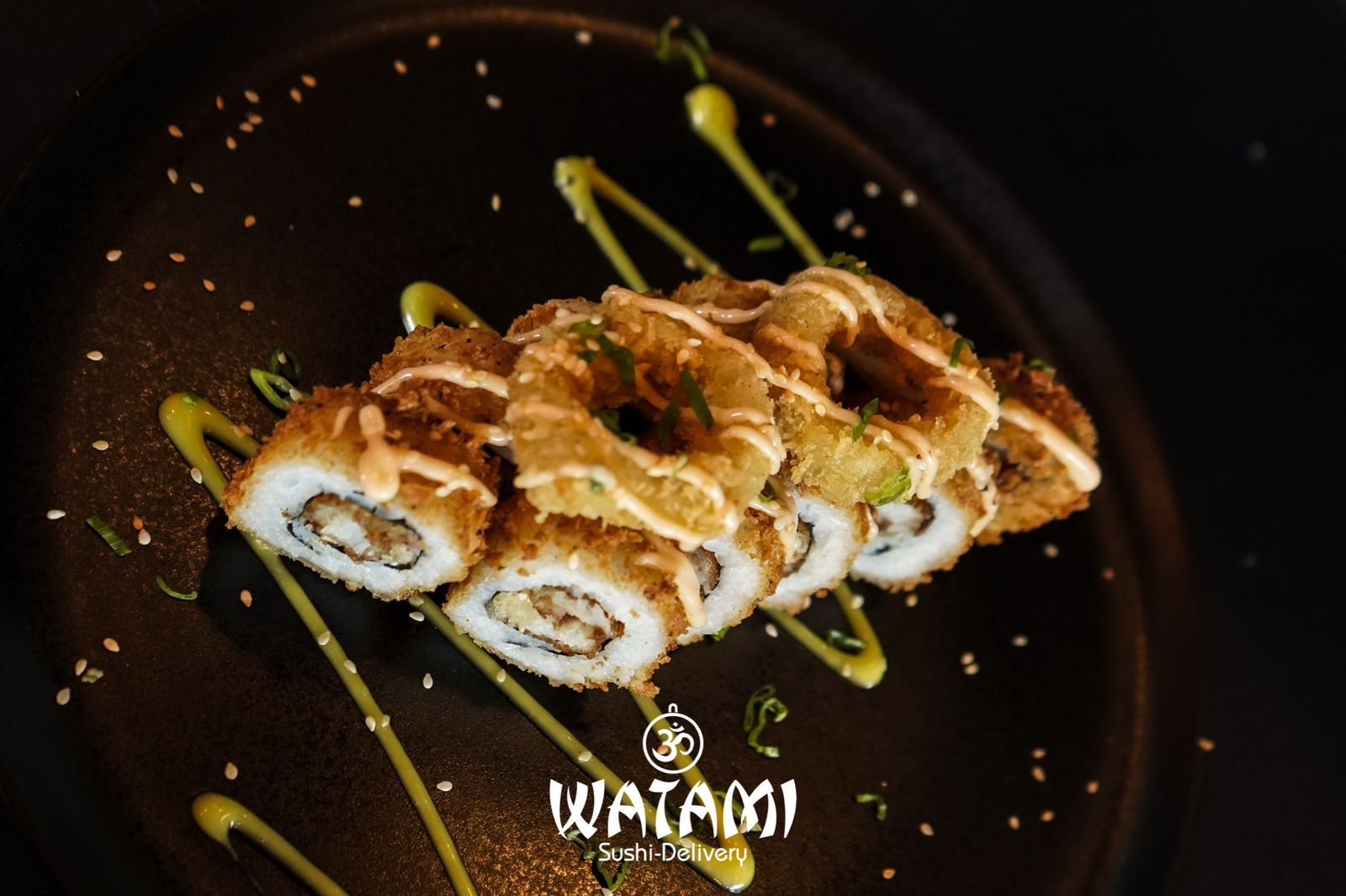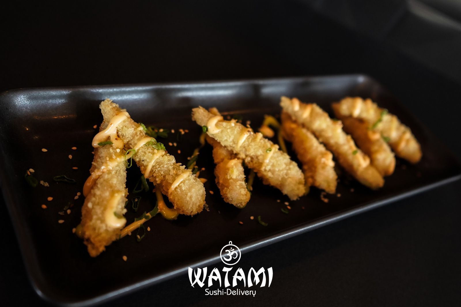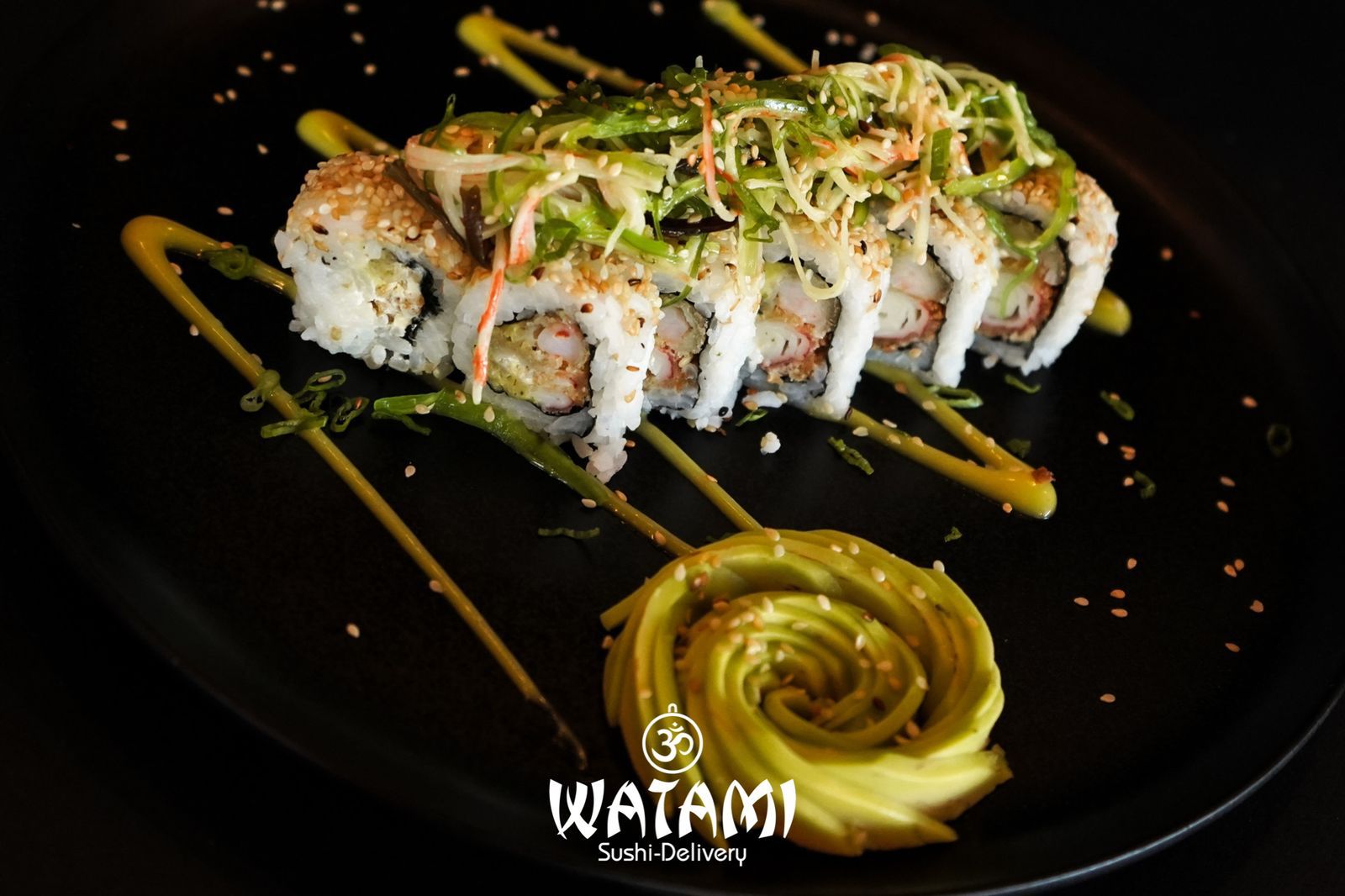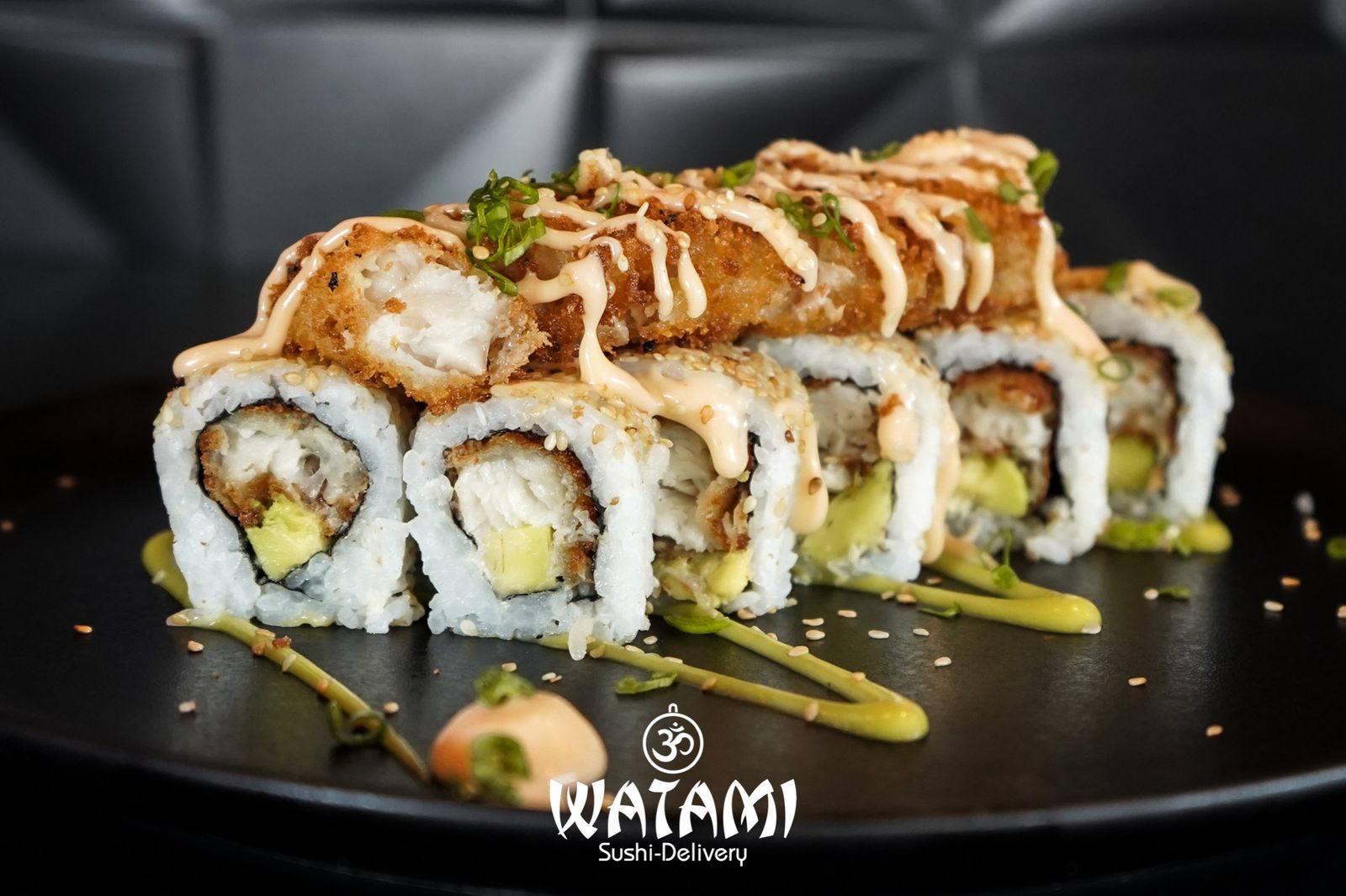 Maki con kanikama importado , langostinos apanados al panko , queso crema , aguacate , masago y ensalada watami especial.