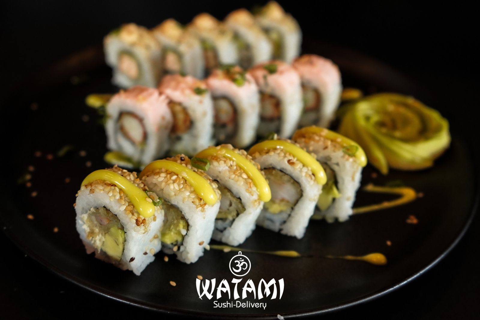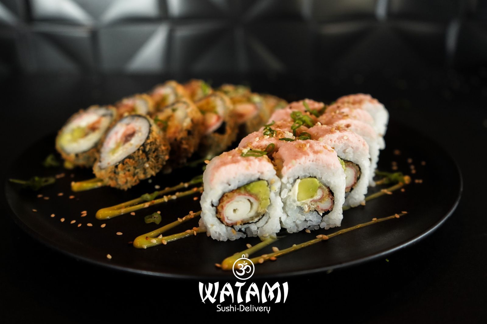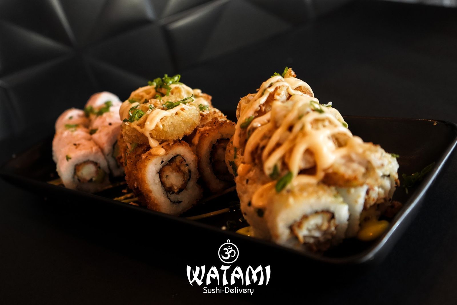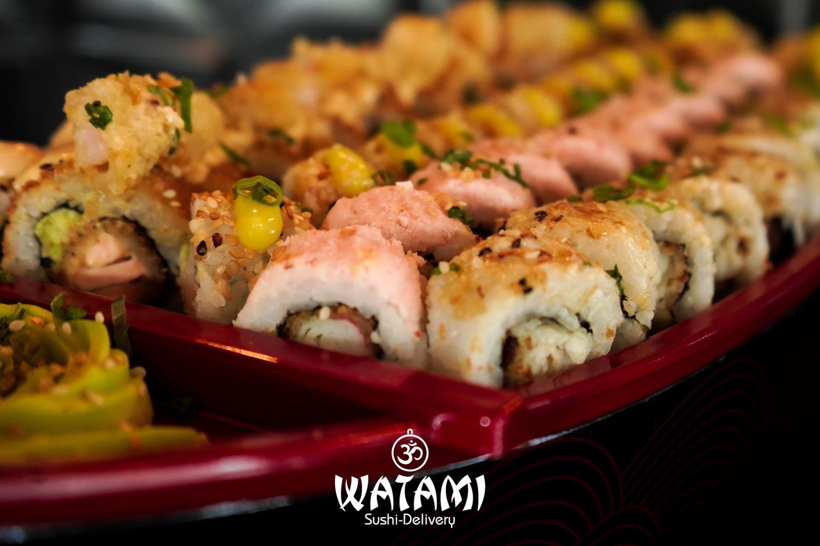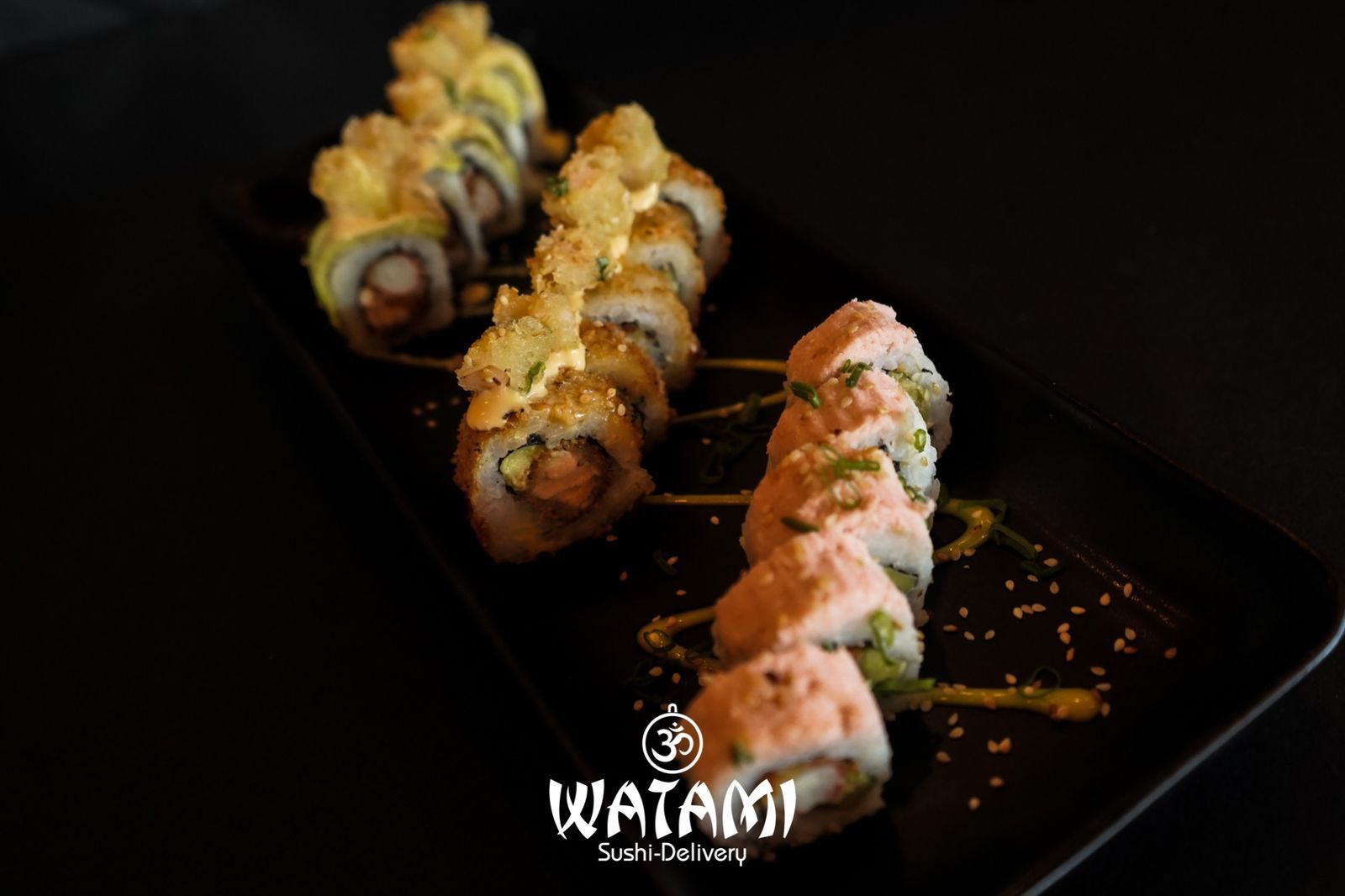 Maki con kanikama importado , langostinos apanados al panko , queso crema , aguacate , masago y ensalada watami especial.