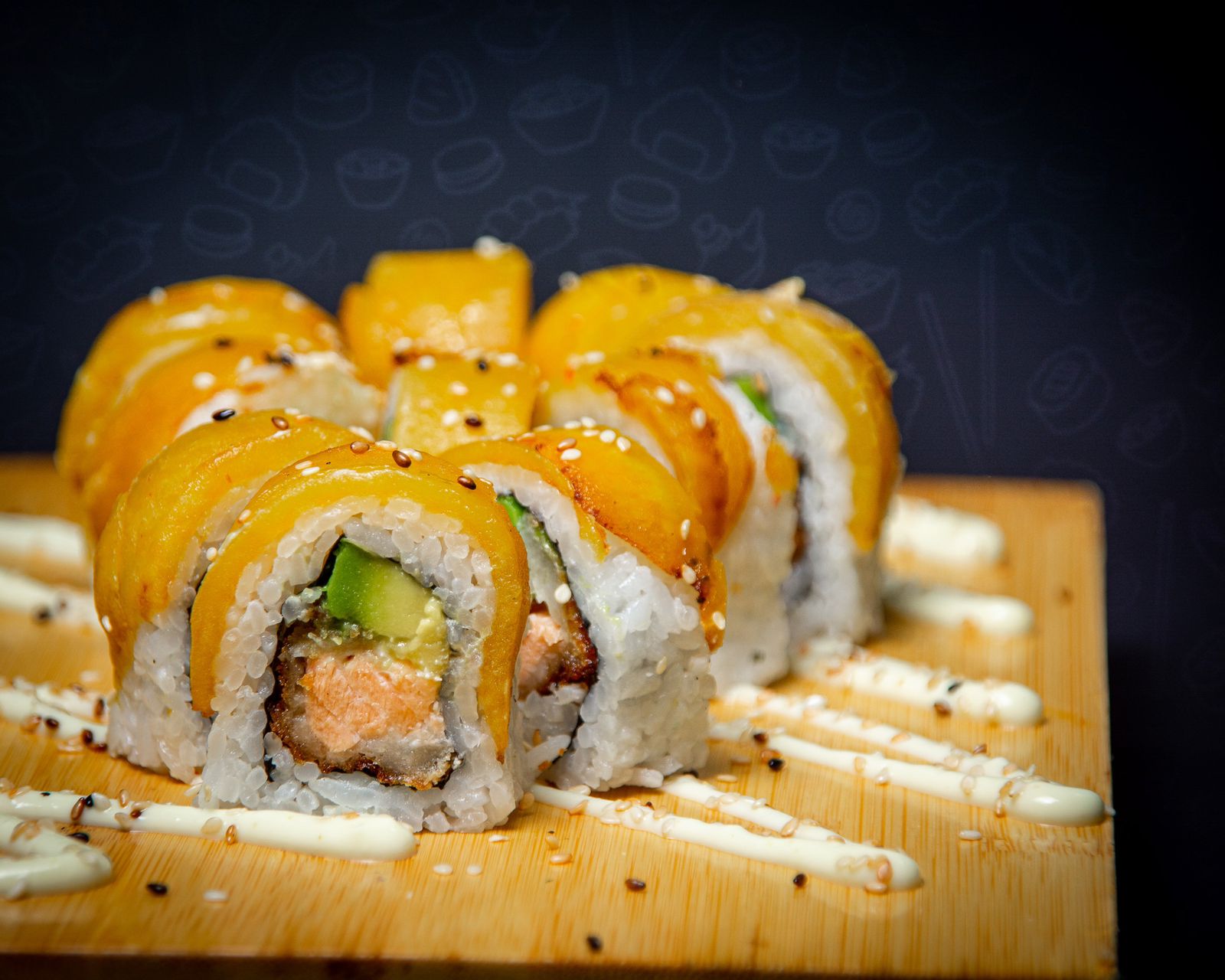 Maki relleno de palmito de cangrejo tempurizado al panko, queso crema y cubierto con tajadas de maduro.