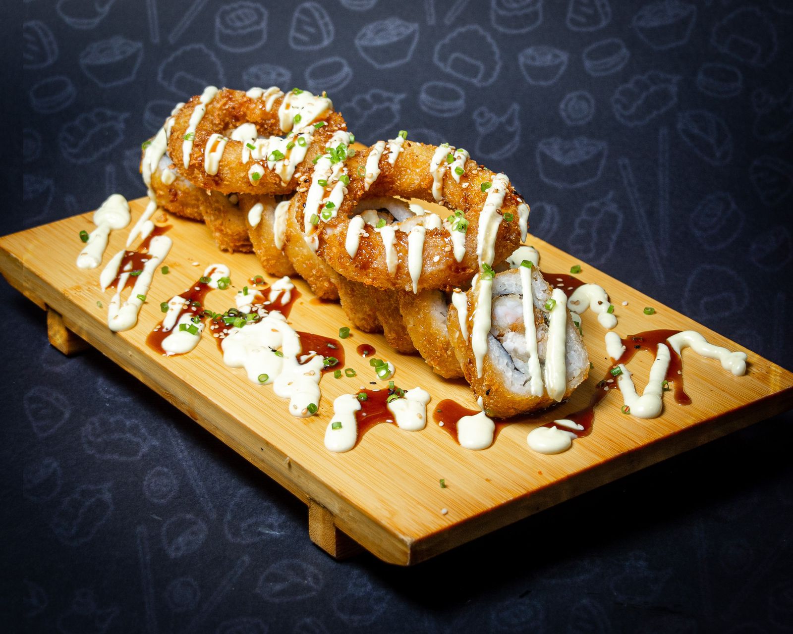 Maki crocante relleno de palmito de cangrejo , pescado blanco crocante y lluvia de anillos de calamar.