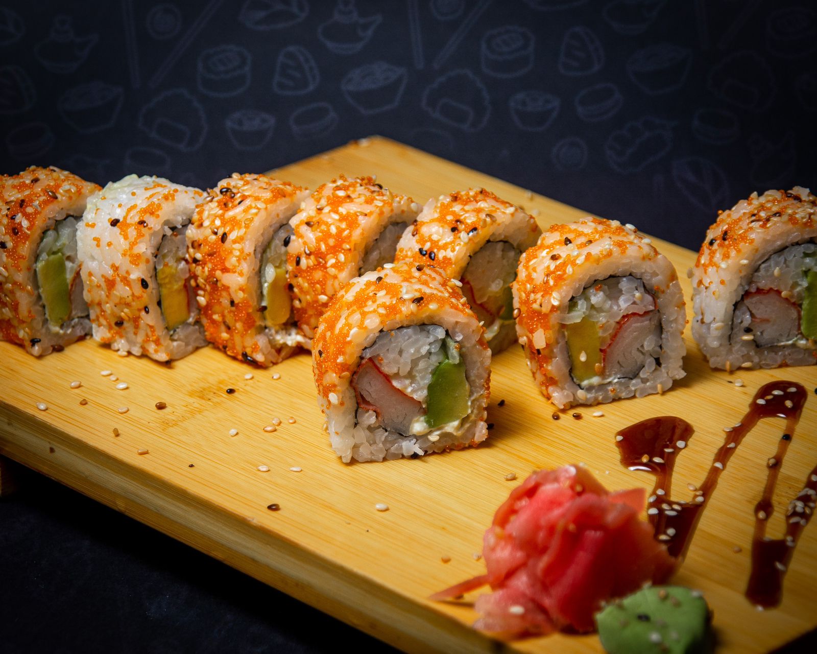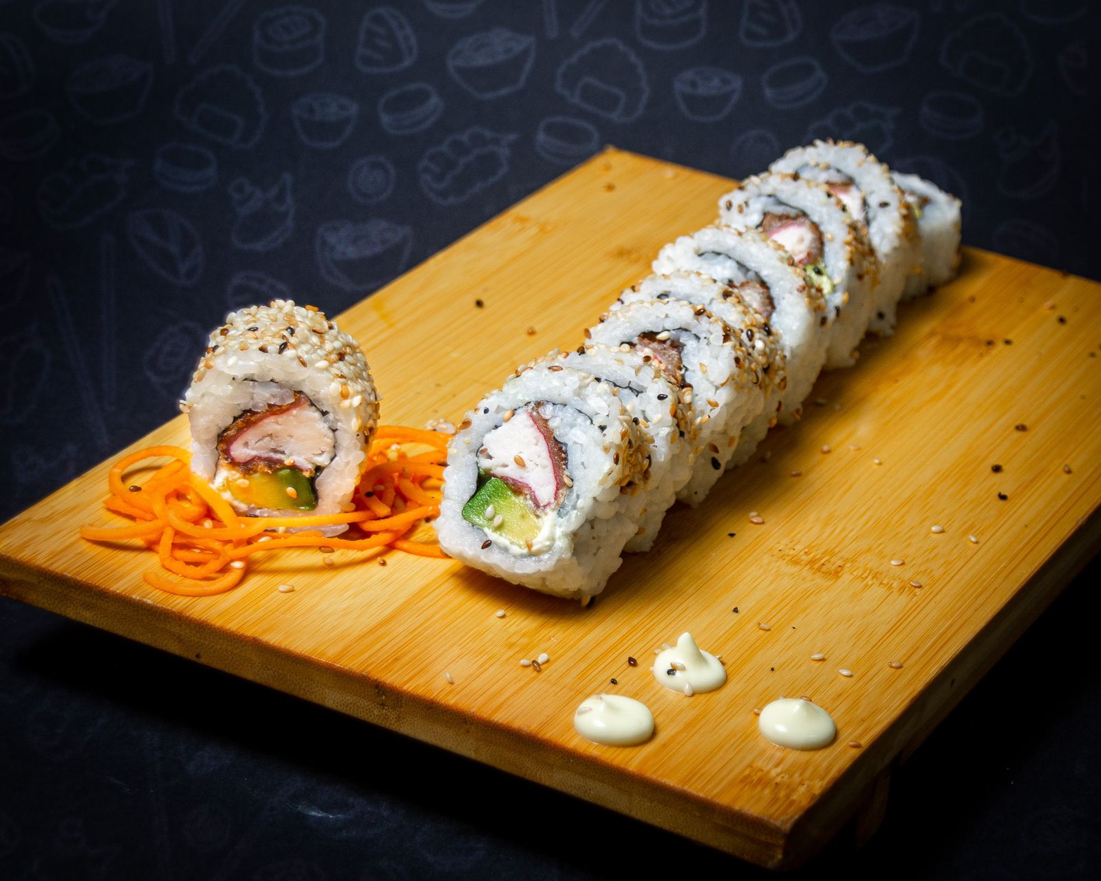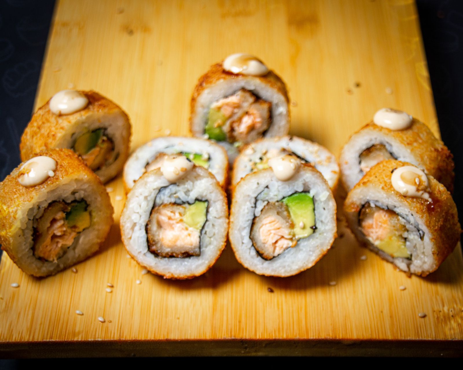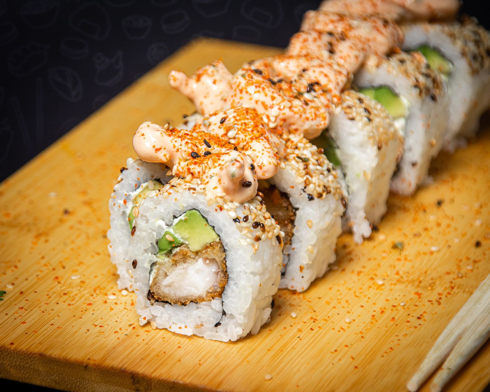 Maki relleno de tilapia, aguacate, queso crema y cubierto con ajonjolí.