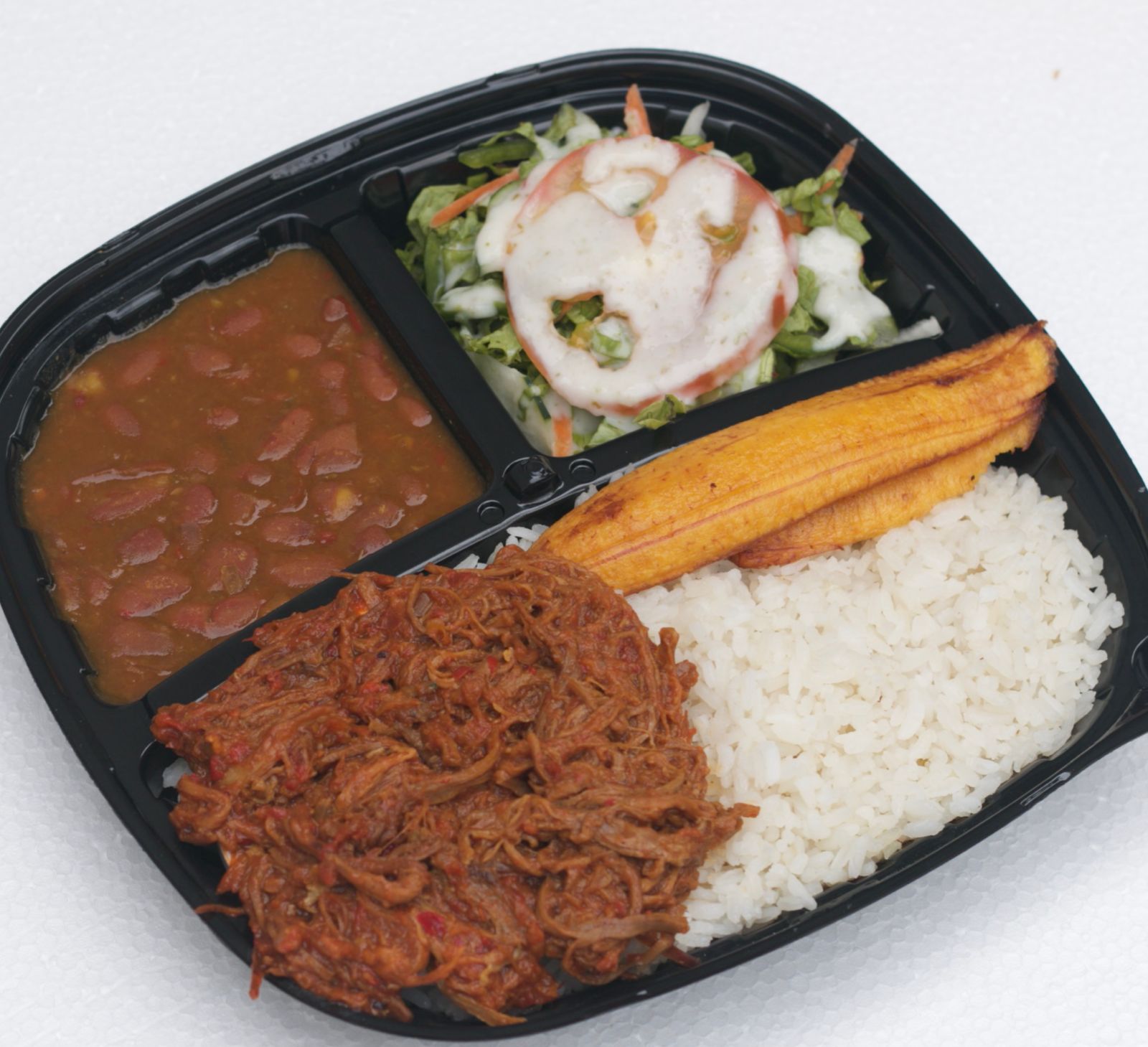 Frijolada servida con carne molida, platanito, chicharrón, chorizo, maíz tierno, papita chongo y aguacate, viene con arroz blanco, arepa maduro y ají. 24 onz