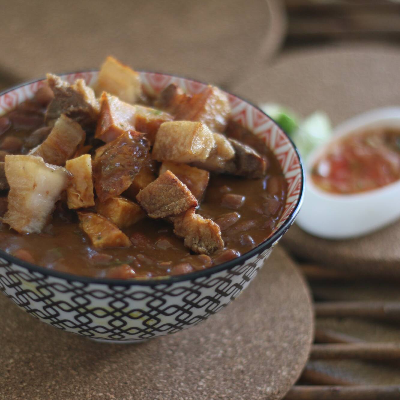 Plato típico de la región paisa, servido con pata de cerdo, chicharrón y chorizo picado, acompañado con arroz blanco, arepa, maduro frito y ají. 32 onz