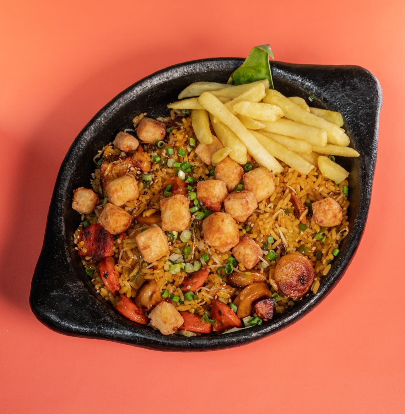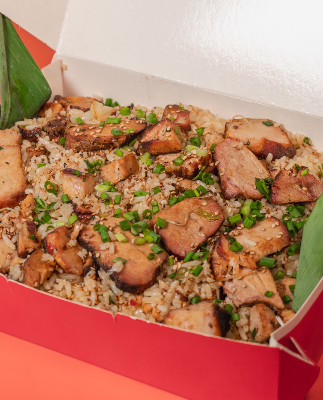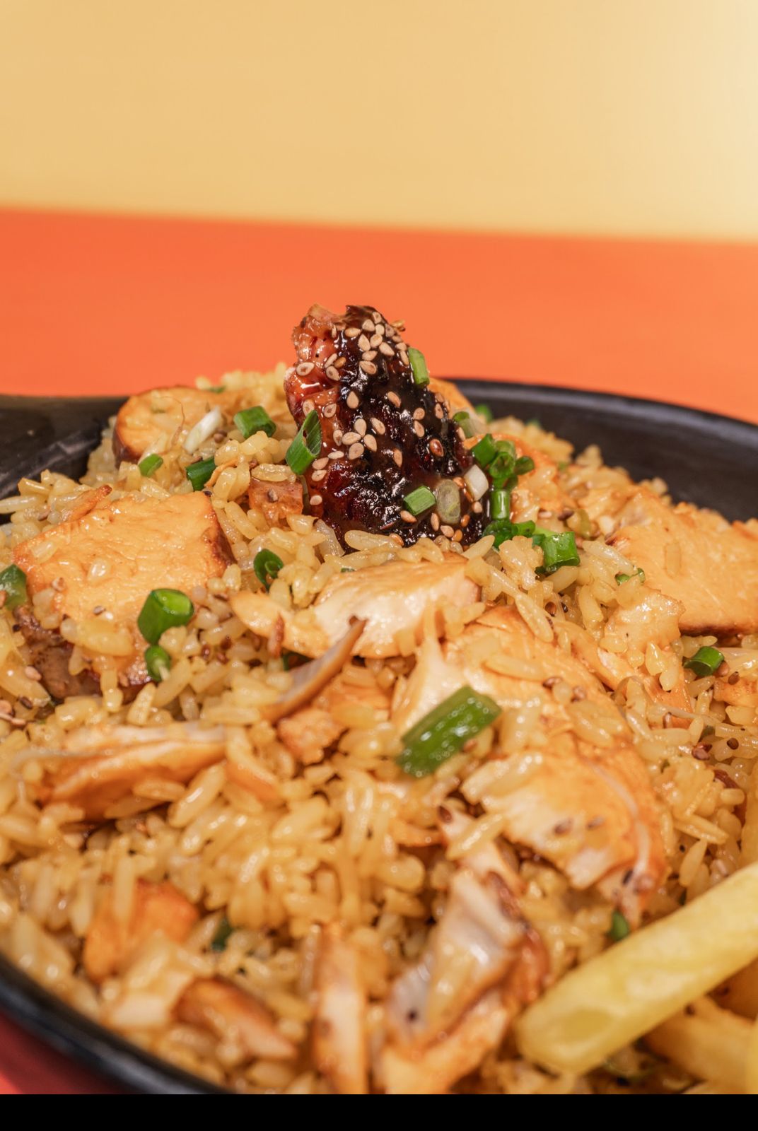 450 gr de delicoso arroz con Cerdo al barril, nuggets de cerdo de la casa, verduras frescas, raíces chinas, cebollín chino, salsas de la casa y decoración de ajonjolí tostado.