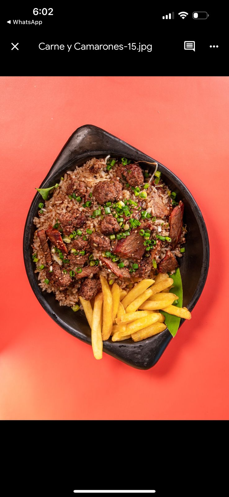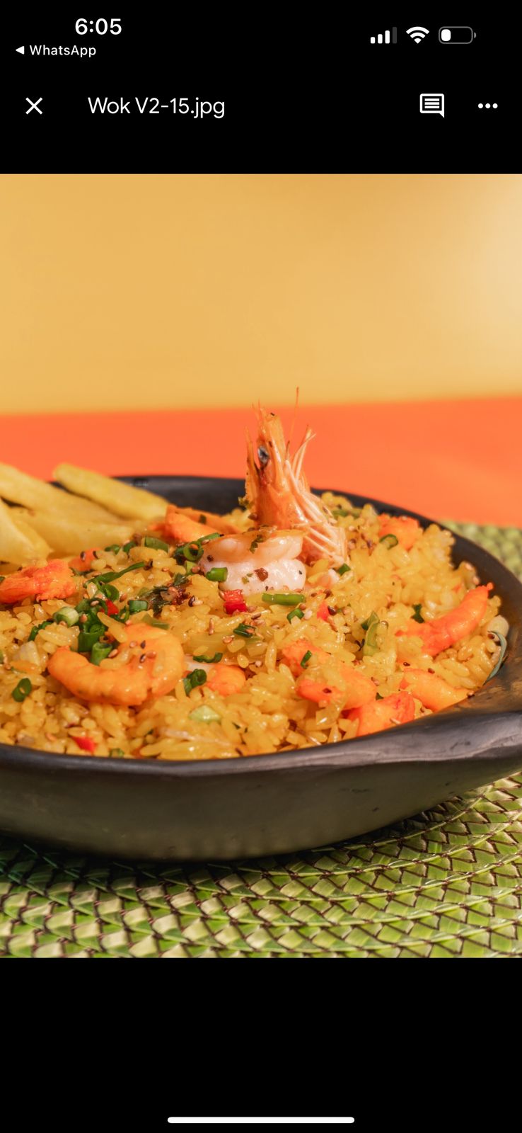 450 gr de delicoso arroz con Camarón, verduras frescas, raíces chinas, cebollín chino, salsas de la casa y decoración de ajonjolí tostado.