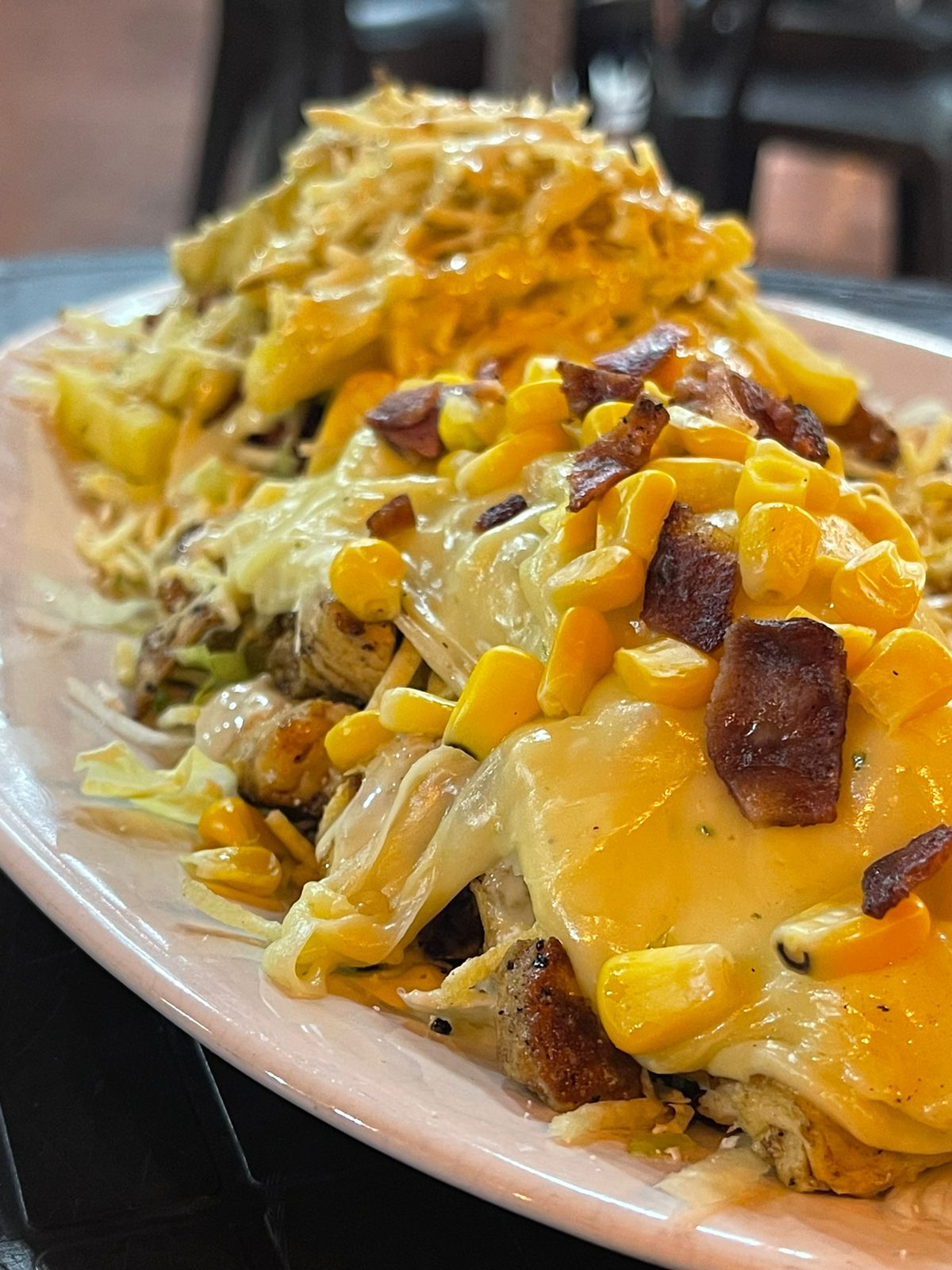 Pollo, salchicha, lechuga, queso, papas francesas, papa ripio y salsa de la casa.