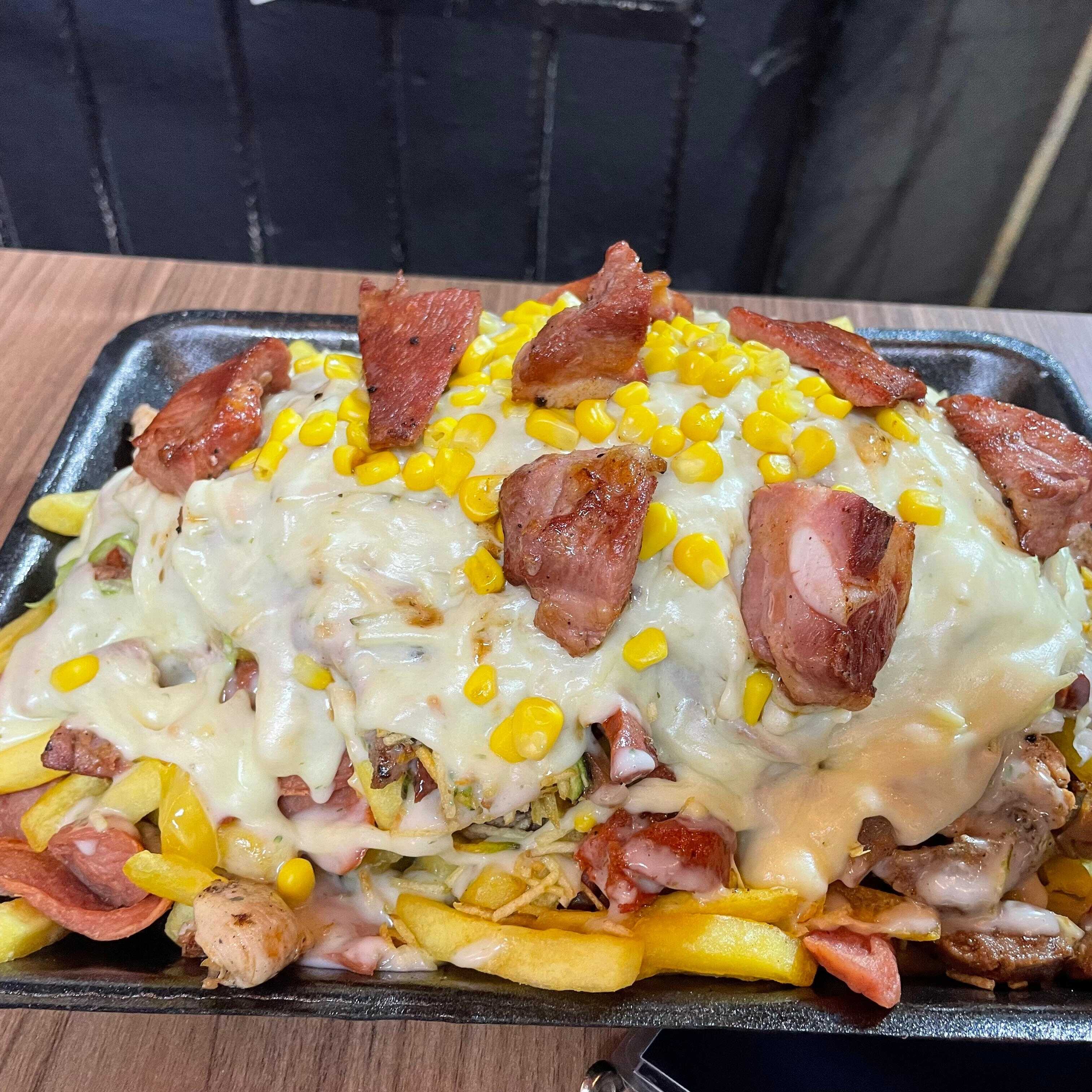pan briochet,carne,pollo,costilla ahumada con BBQ ,mozzarrela y cebolla grillet