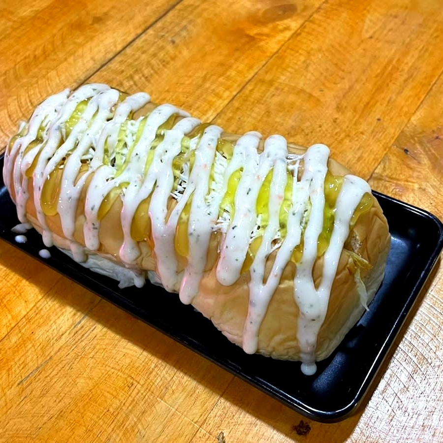 Pan relleno de trocitos de pollo, lechuga, salsa, chongo, queso.
