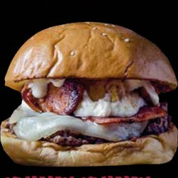 Pan artellano, 150 g de angus certified, queso americano fundido, tocineta, cebolla caramelizada, ardiente chipotle artesanal y salsa de la casa.