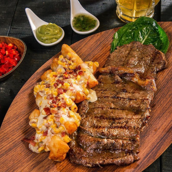 300 g De delicioso corte de lomo, acompañado de croquetas de yuca apanada con un fundido de queso especial de la casa más ensalada.