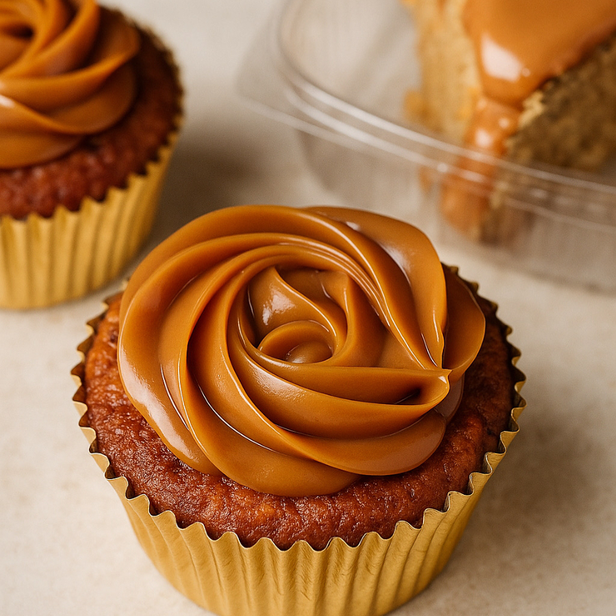 Cupcakes de vainilla en harina de almendras y avena sin gluten, sin lácteos, sin azúcar añadida, rellenos con arequipe de almendras y arriba también llevan arequipe de almendras. disfrútalos sin remordimientos.