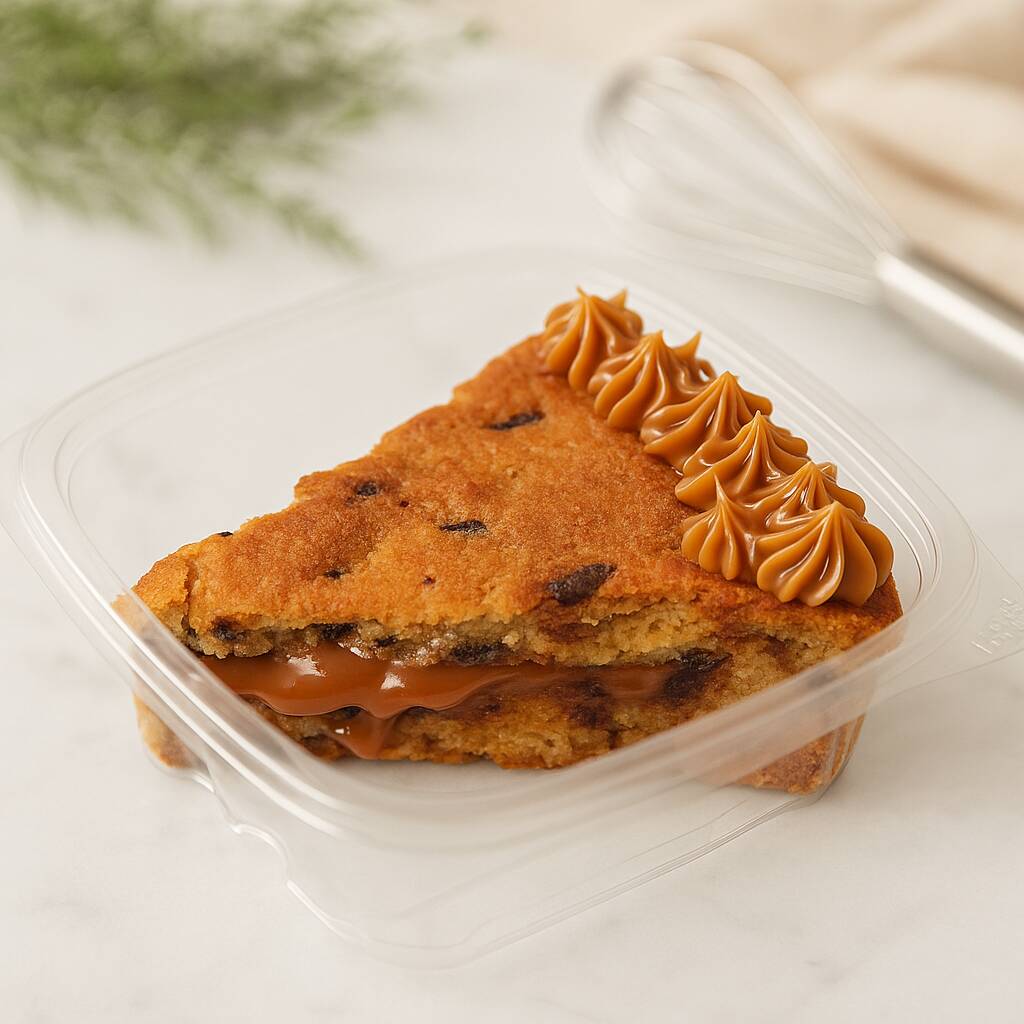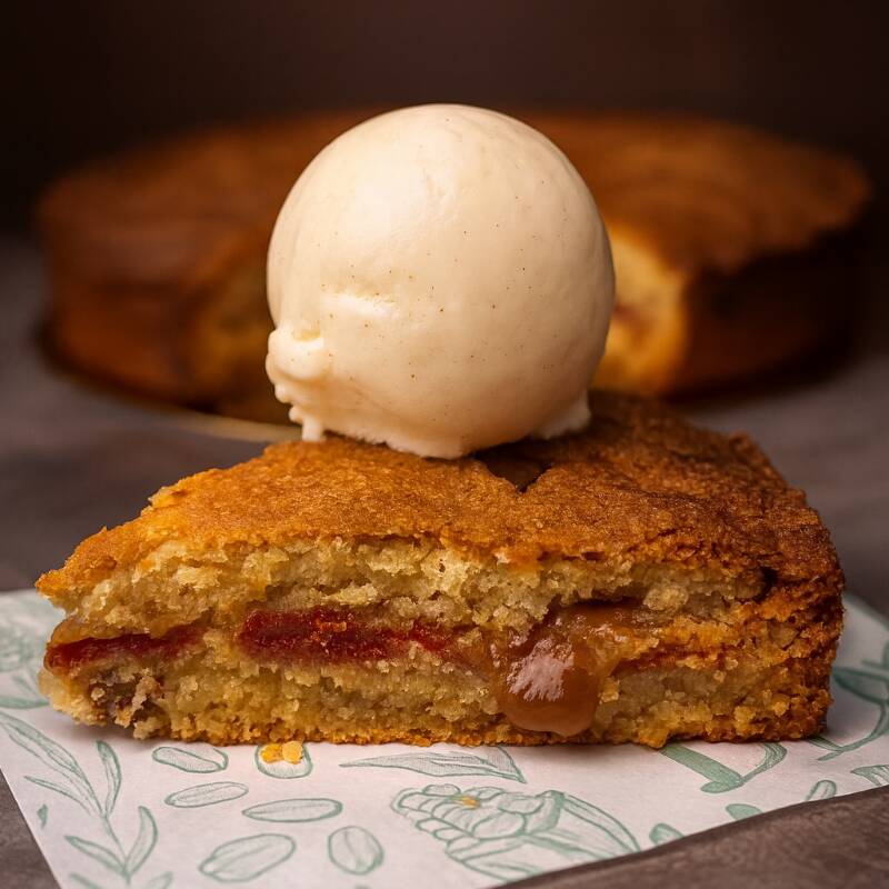 Cookie pie a base de harina de almendras, chips de chocolate sin azúcar, bocadillo sin azúcar y arequipe de almendras, acompañado de un a deliciosa bola de helado vainilla stevia.