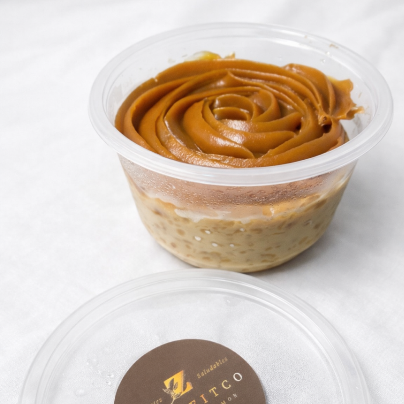 Pudín de vainilla en harina de almendras y avena sin gluten, arequipe de almendras, endulzada con stevia, libre de lácteos, sin azúcar añadida.