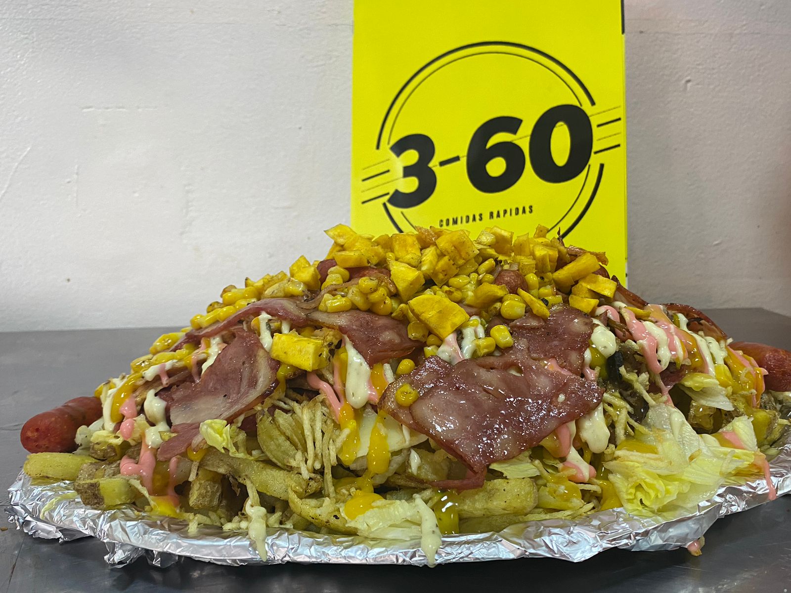 400 Gr de papa francesa, salchicha, queso mozarela, lechuga, costillas bbq, chicharrón, plátano maduro, maíz tierno, cebolla, papa cabello ángel, salsas