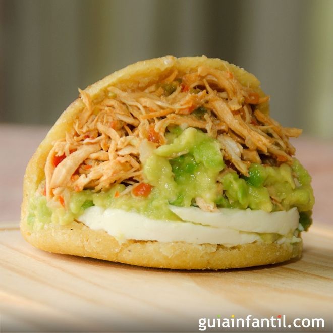 Arepa de maíz, queso mozarela, pollo desmechado, carne desmechada, jamón , maíz tierno, cebolla, guacamole , tocineta,salsas.