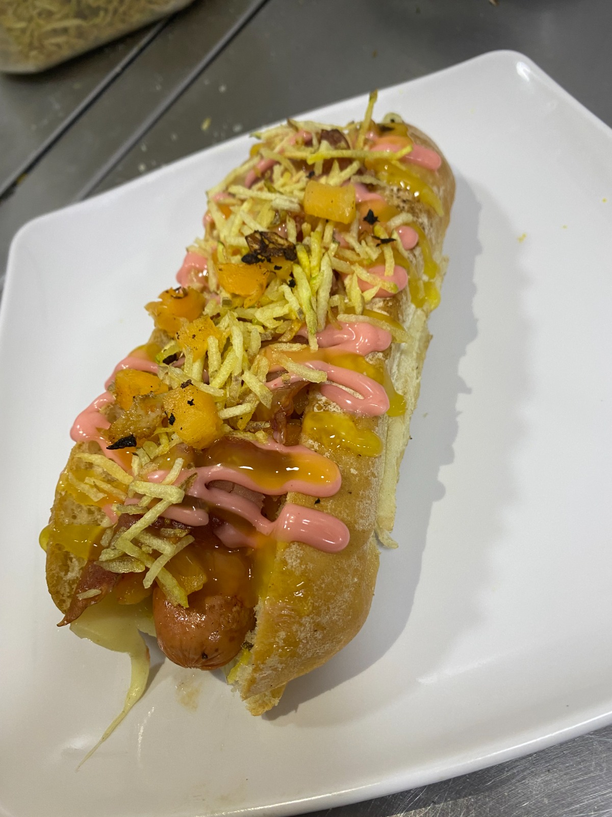 Pan brioche, salchicha americana, piña brunoise, queso mozarela, lechuga. cebolla, jamón, papas cabello de ángel, salsas.