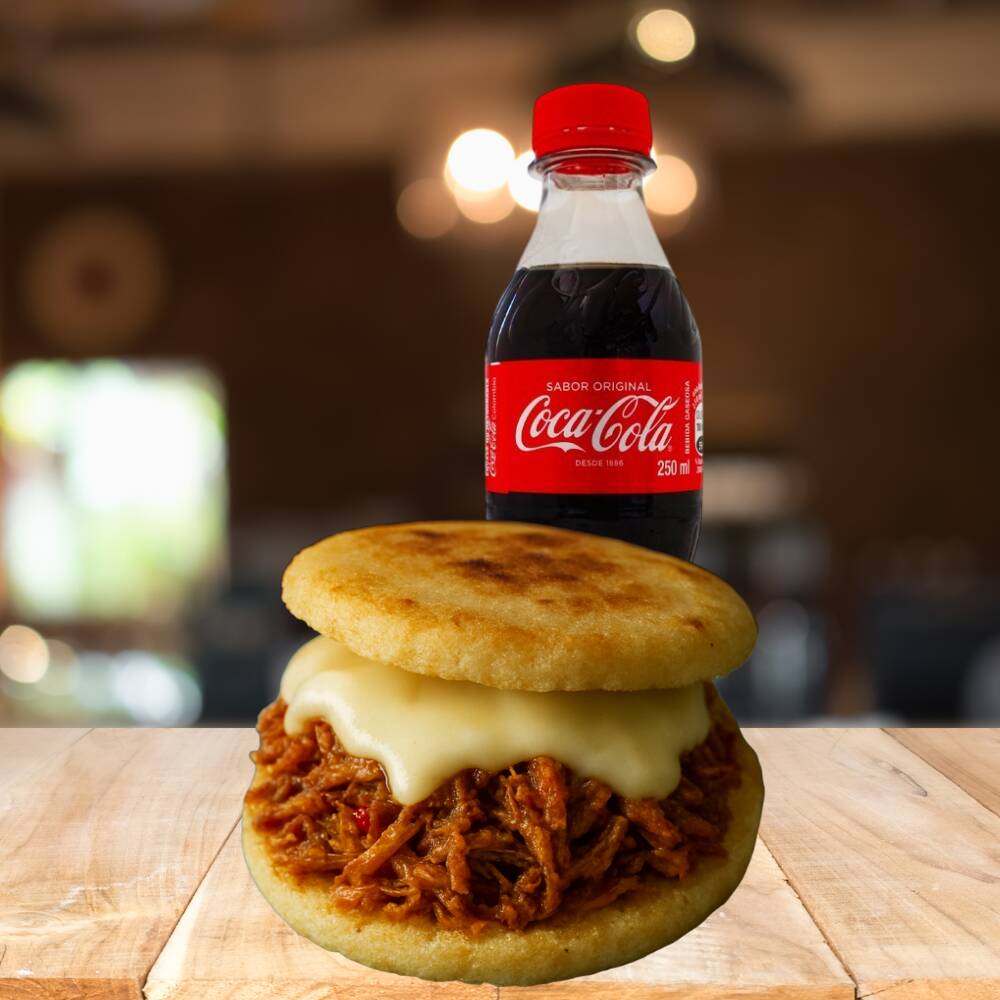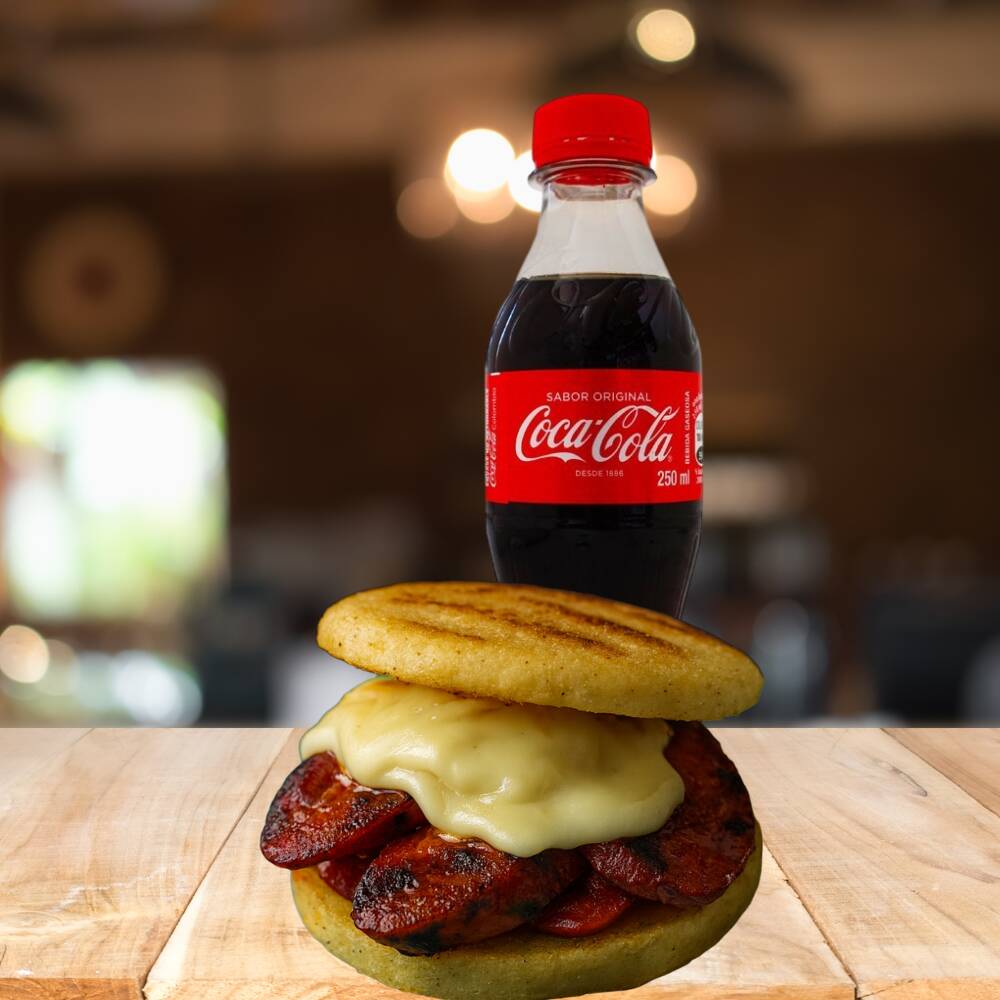 Coca Cola 250 Ml*1 + Arepa Rellena con Chorizo Santarosano.*1 (Arepa de maíz peto acompañada de queso derretido, chorizo santarrosano artesanal y un toque fresco de pepinillos agridulces.)