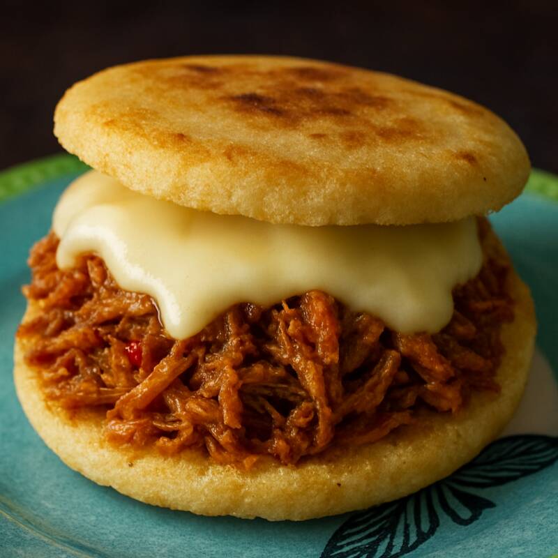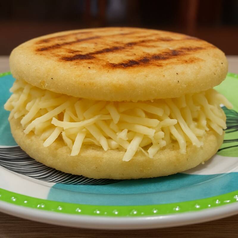 Arepa artesanal de maíz peto, suave y ligeramente dulce, rellena con queso derretido para un sabor tradicional y delicioso. ideal para el desayuno o como acompañante en cualquier momento.