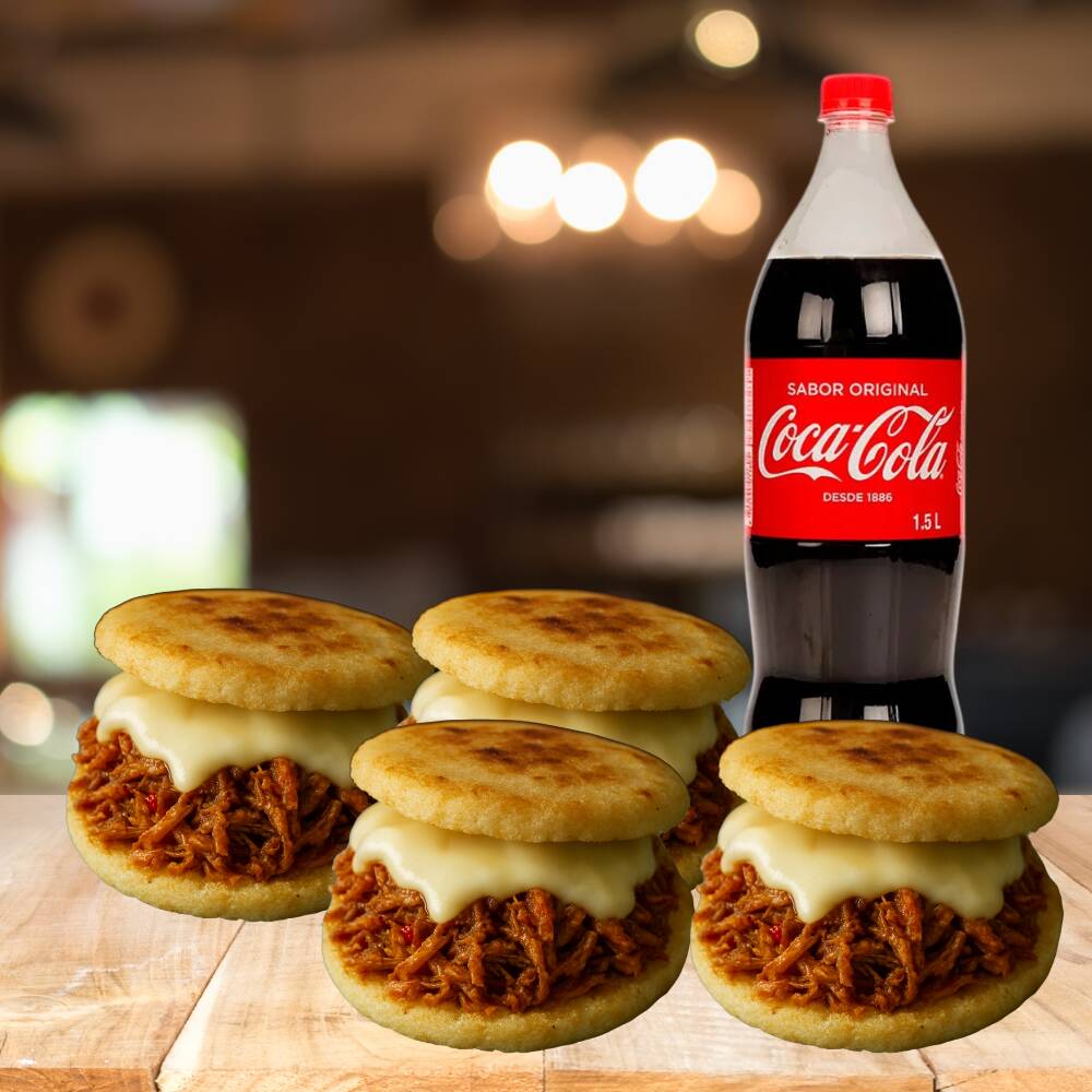 Coca Cola 1.5 Lt*1 + Arepa Rellena Mixta (Carne/Pollo) con Hogao*4 (Arepa de maíz rellena de carne y pollo con una salsa hogao preparada con tomate fresco, cebolla y especias.)