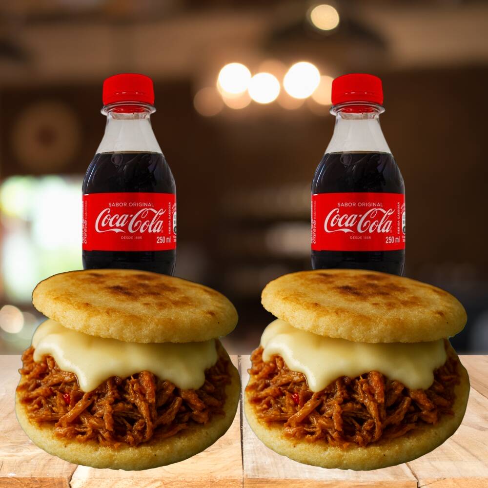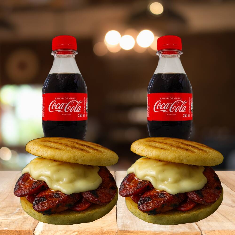 Coca Cola 250 Ml*2 + Arepa Rellena con Chorizo Santarosano.*2 (Arepa de maíz peto acompañada de queso derretido, chorizo santarrosano artesanal y un toque fresco de pepinillos agridulces.)