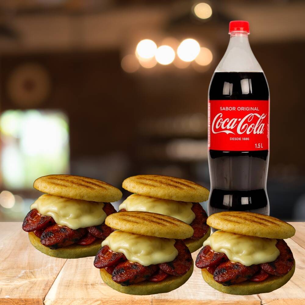 Coca Cola 1.5 Lt*1 + Arepa Rellena con Chorizo Santarosano.*4