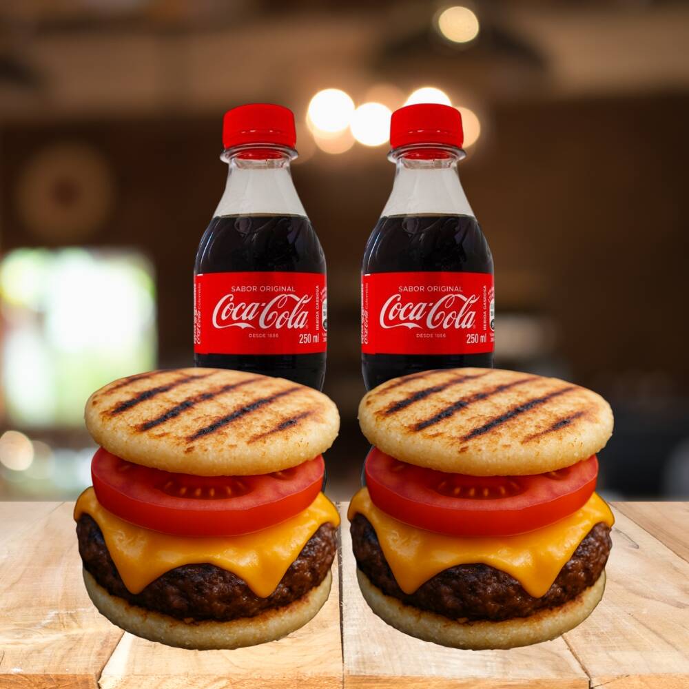 Coca Cola 250 Ml*1 + Areburguer Americana*1 (Hamburguesa con base de arepa de maíz peto con queso, rellena con carne, queso cheddar, tomate y pepinillos agridulces)