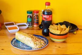 2 Burros especiales rellenos de carne molida, carne desmechada, chorizo ranchero, maíz tierno, ensalada pico de gallo, queso doble crema, lechuga + 1 porción de totopos + 2bebidas personales 400ml (sabor según disponibilidad)