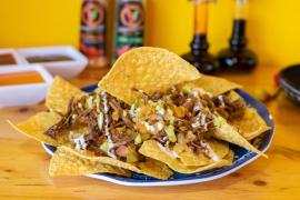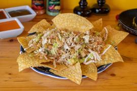 Totopos con carne desmechada, pollo desmechado, pico de gallo, queso doble crema, sour cream y guacamole.