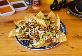 Totopos con carne molida, carne desmechado, chorizo ranchero, ensalada pico de gallo, queso doble crema, sour cream y guacamole.