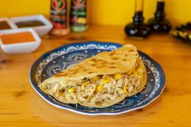 Tortilla rellena de pollo desmechado, maíz tierno y queso doble crema.