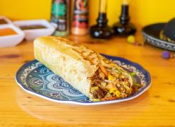 Tortilla rellena de carne molida, carne desmechada, pollo desmechado, chorizo ranchero, maíz tierno, ensalada pico de gallo, queso doble crema y lechuga.