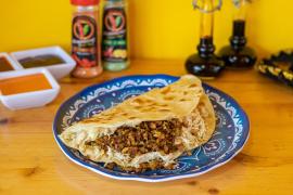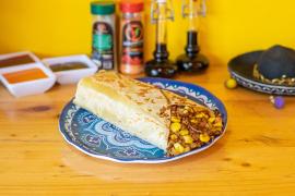 Tortilla rellena de carne molida, pollo desmechado y queso doble crema.