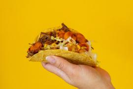 Tortilla de maíz tostado rellena de carne desmechada, chorizo ranchero, maíz tierno, queso doble crema y lechuga.