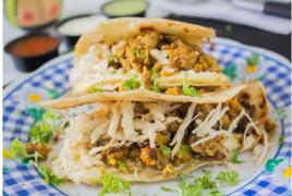 3 Tortillas de maiz rellenas de carne molida, carne desmechada, chorizo ranchero, maiz tierno, pico de gallo, salsa de la casa y limon.