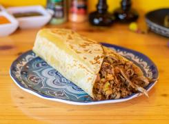 Tortilla rellena de carne desmechada, chorizo ranchero y queso doble crema.