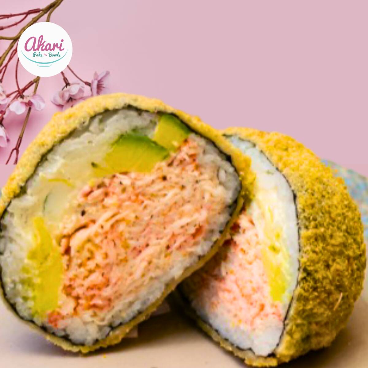 Arroz de sushi, rellena de queso crema, aguacate cremoso, ensalada dinamita de cangrejo aderezada con mayonesa japonesa, acompañada con salsa teriyaki.