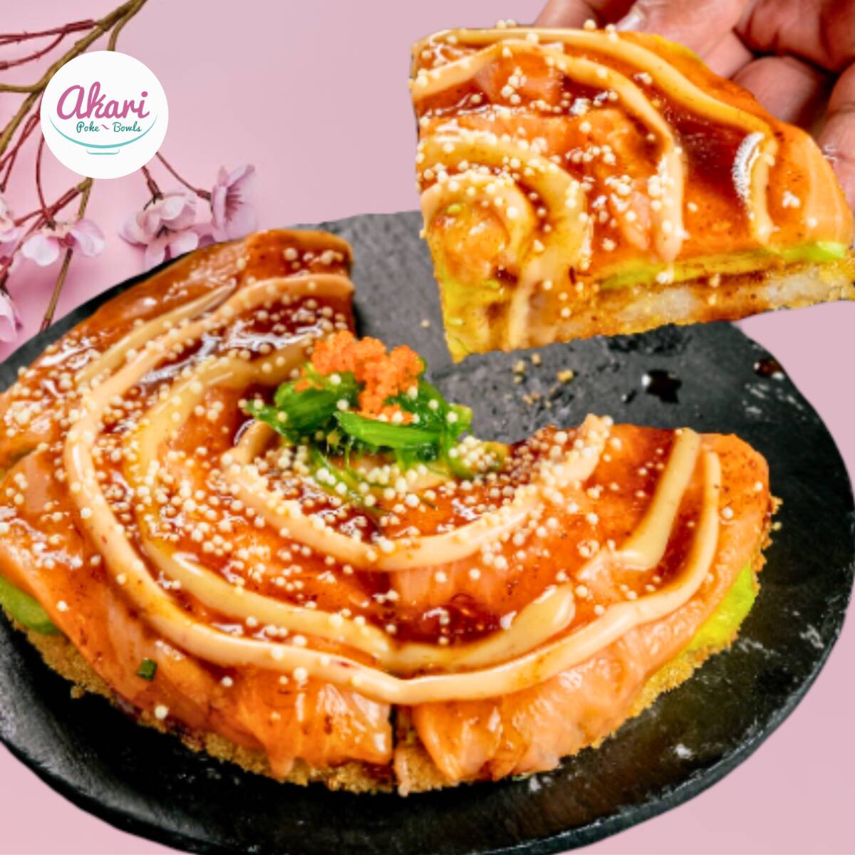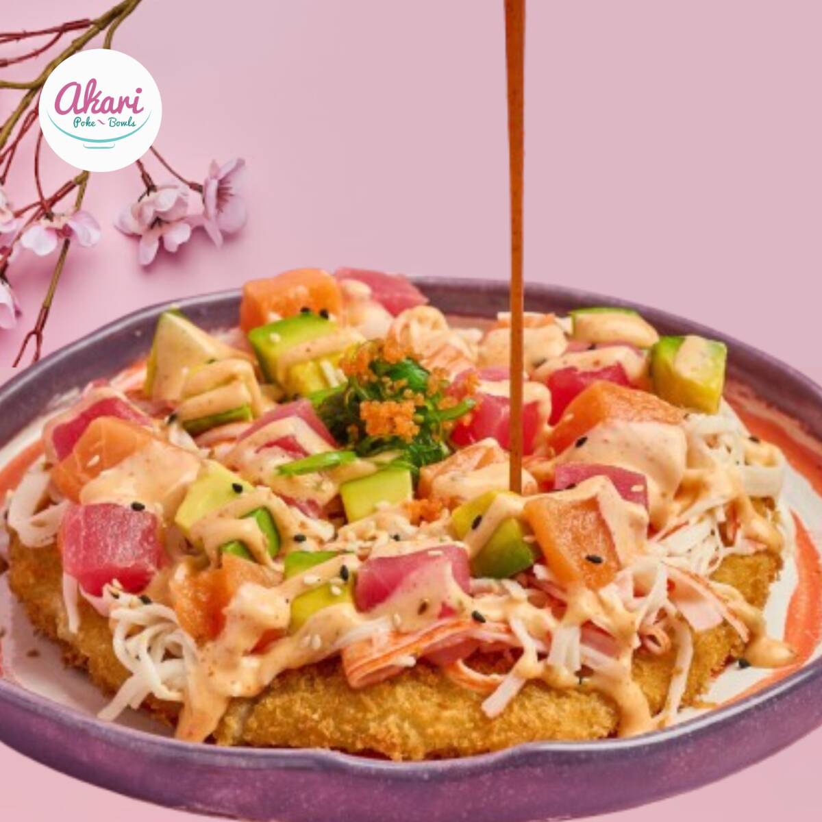 Base de arroz crocante cubierta de una combinación de cubos de salmón, atún y cangrejo, aderezado con mayonesa japonesa y masago, bañado con salsa teriyaki y mayo spicy, coronado con ensalada de algas, y semillas de sésamo tostadas.