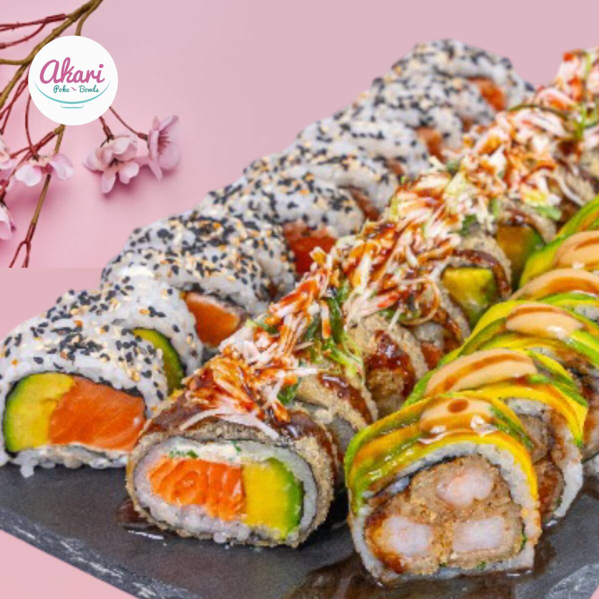 30 Piezas de sushi, 10 piezas de alaska roll con salmón, queso crema, topping de aguacate, salmón, wakame y masago, 10 piezas tiger especial y 10 piezas agu roll langostinos crocantes, cebollina, queso crema con topping de aguacate, bañado en salsa fuji y teriyaki.