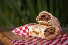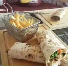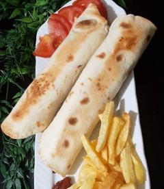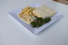 Carne con perejil y hierbabuena en pan árabe, papa francesa, tabule (con perejil) y tahine (crema de garbanzo y ajonjolí).