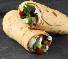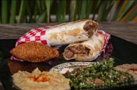 El sándwich que escojas, acompañado de tabule, tahine (crema de garbanzo), metabbal (crema de berenjena ahumada), labane (queso crema árabe), kibbe (croquetas de carne y trigo) y pan árabe.