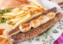 Pinchos de kafta y pollo, papa francesa, tabule (con perejil), tahine (crema de garbanzo y ajonjolí) y pan árabe.