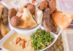 Variedad de entradas árabes, tahine (crema de garbanzo), tabule, metabbal (crema de berenjena ahumada), lábane (queso crema árabe), kibbe (croquetas de carne y trigo), falafel (croquetas vegetarinas), kafta, empanadas, indios de parra y repollo, pan árabe.