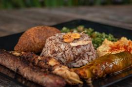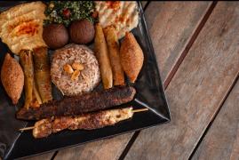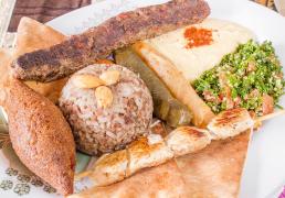 Arroz con almendras, pincho de pollo, pincho de kafta, indios de repollo y parra, kibbe, tahine (crema de garbanzo), tabule, metabbal (crema de berenjena ahumada), falafel y pan árabe.