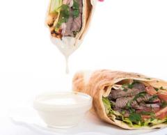 Trocitos de carne al horno con salsa de tahine (crema de garbanzo y ajonjolí).