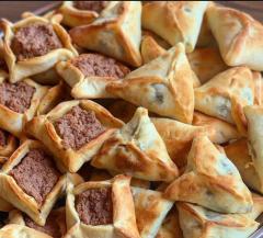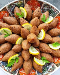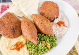 Variedad de kibbes rellenos de espinaca, queso, labane y el tradicional, acompañado de tahine (crema de garbanzo), tabule ensalada de la casa árabe con perejil y metabbal (crema de berenjena ahumada).