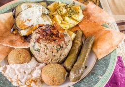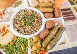 Variedad de entradas vegetarianas, arroz de lentejas, empanadas de queso y espinacas, falafel, kibbe vegetariano, shakshuke (pimentones salteados), lábane, metabbal (crema de berenjena ahumada), tahine (crema de garbanzo), tabule y pan árabe.
