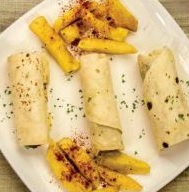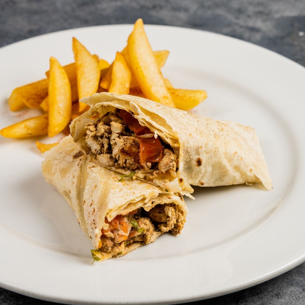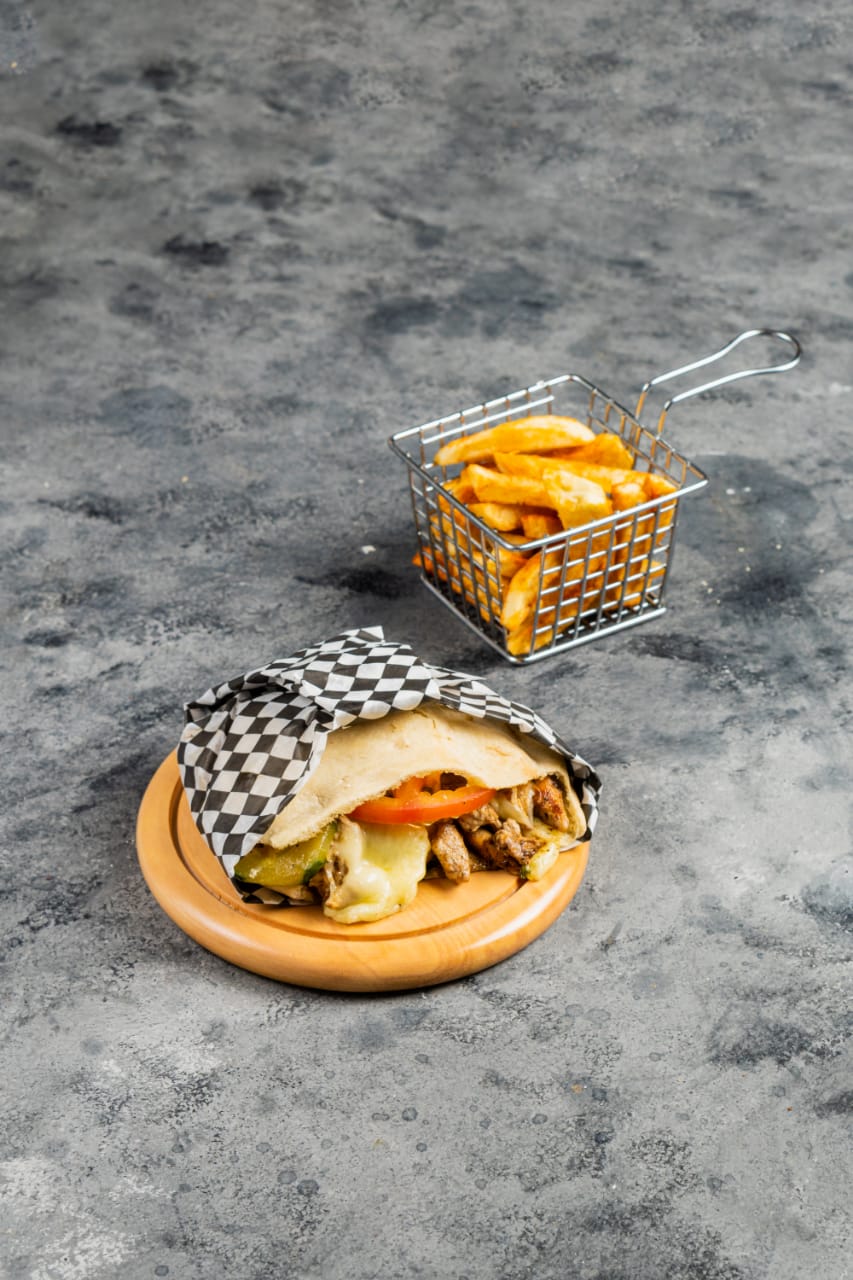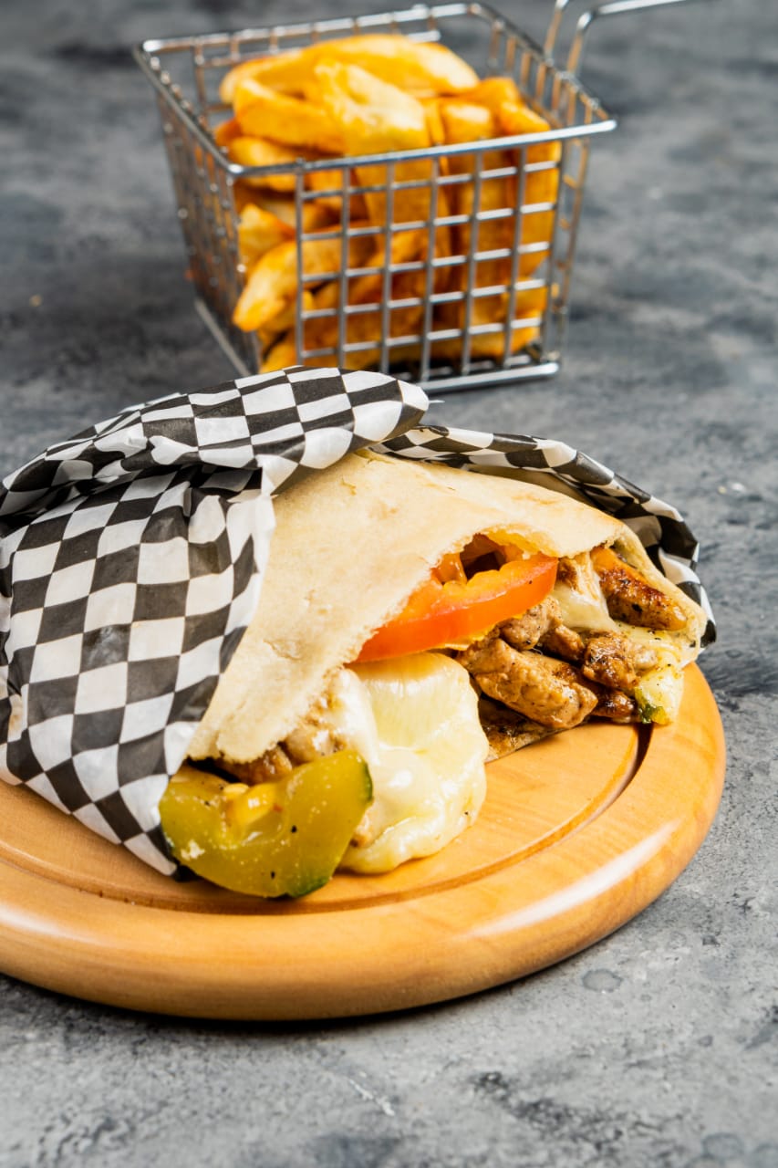 Pan árabe relleno de pollo y queso, acompañado de papas a la francesa.