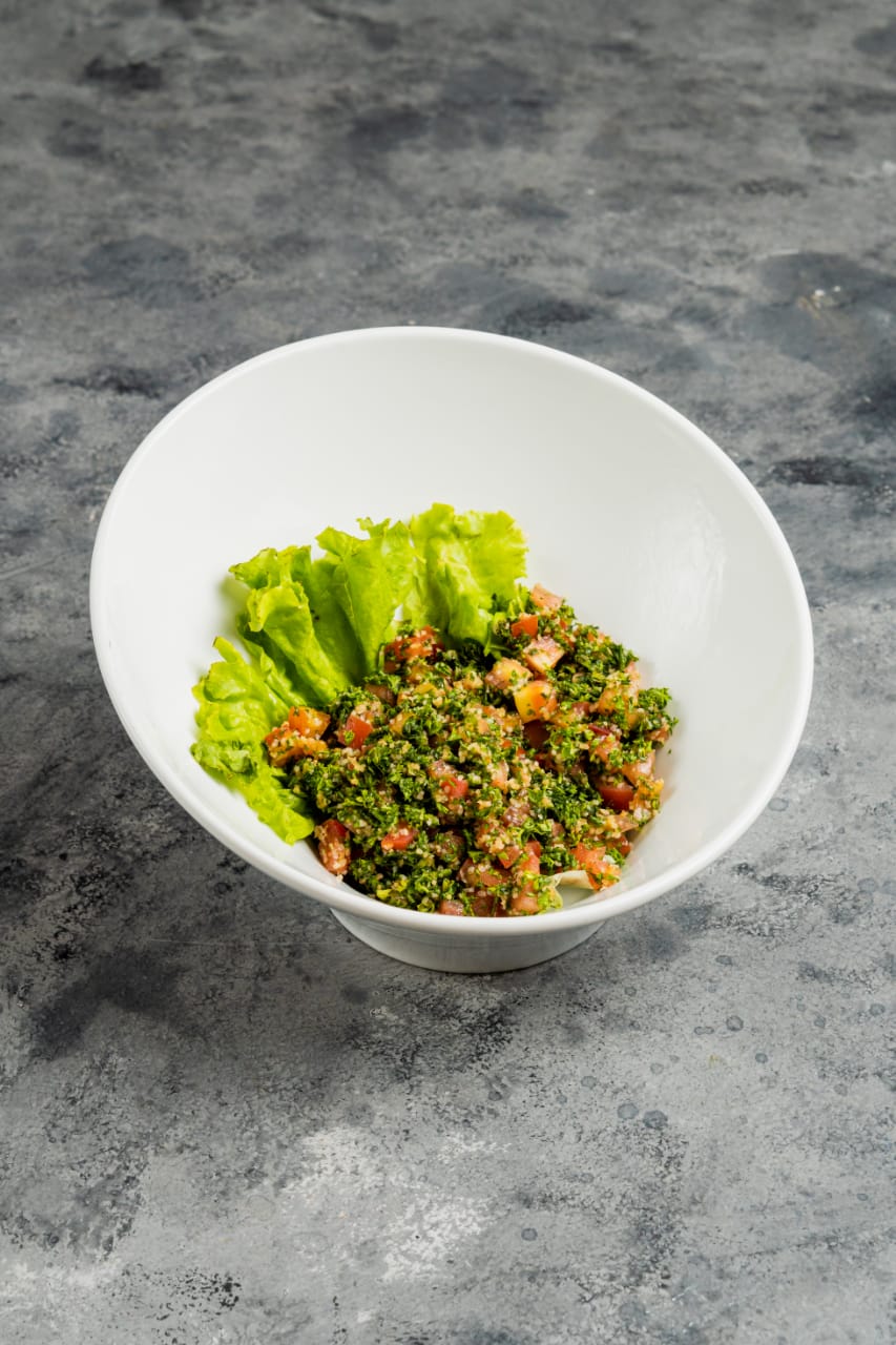 Una mezcla de perejil, finamente picado, trigo burguf, aceite de oliva, tomate y otras hierbas aromáticas.